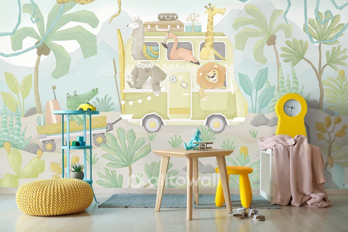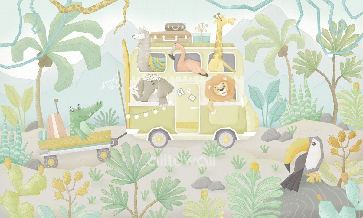 Детские обои со зверушками-путешественниками мы создали в трёх разных цветовых палитрах. Этот сюжет выполнен в пастельных оттенках зелёного, жёлтого, коричневого и персикового. Нежные оттенки подойдут даже для комнаты новорождённого.