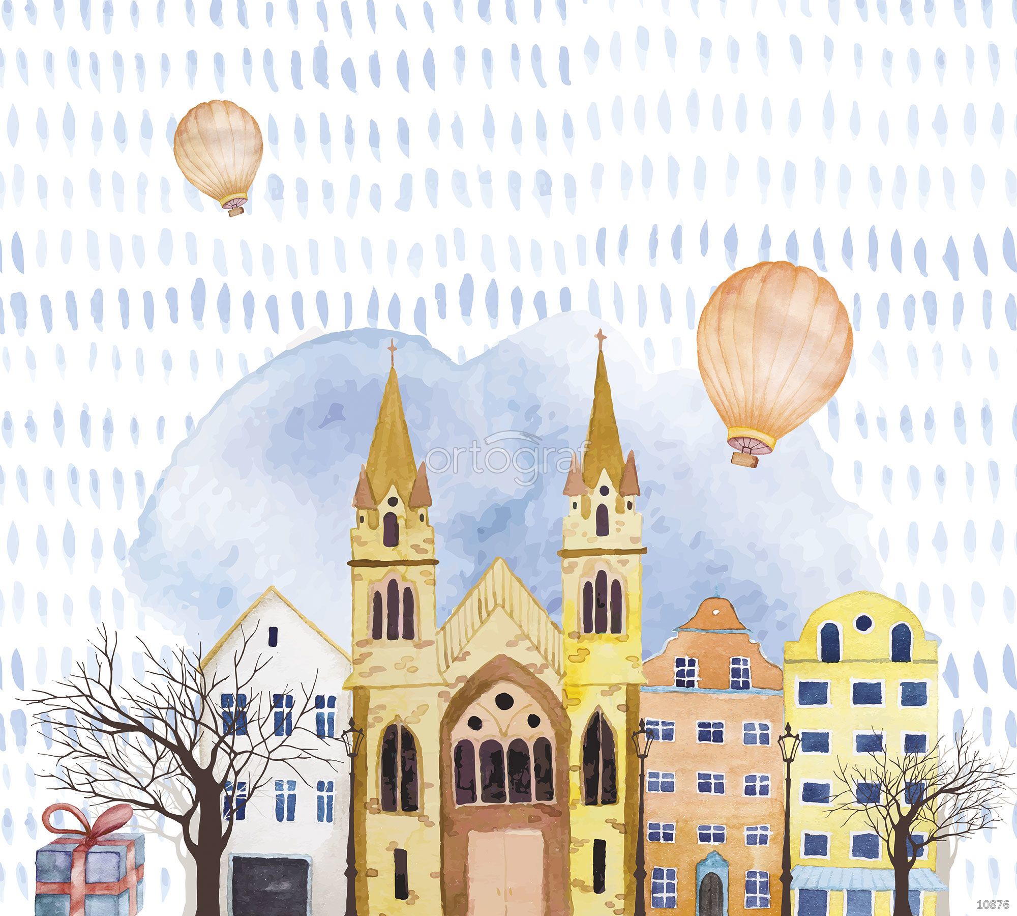 На изображении представлен сюжет старинного городского пейзажа с внушительным собором, выделяющимся массивными башнями и арочными окнами. Справа и слева от собора – исторические городские дома, а в небе парят воздушные шары, создавая атмосферу праздника и лёгкой мечтательности. Композиция подчёркивает сочетание архитектурного наследия и романтической атмосферы, характерной для сказочных европейских городских видов.