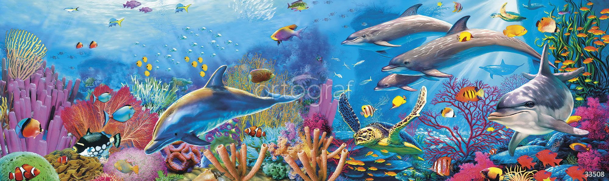 Яркая и насыщенная сцена подводного мира с дельфинами, рыбами, черепахой и кораллами создает атмосферу радости, вдохновения и познания природы. Такой сюжет наполняет пространство энергией и дарит ощущения приключения, а игра света подчеркивает глубину и прозрачность воды. Лучше всего подойдет для оформления детской или ванной комнаты, делая интерьер динамичным и увлекательным.