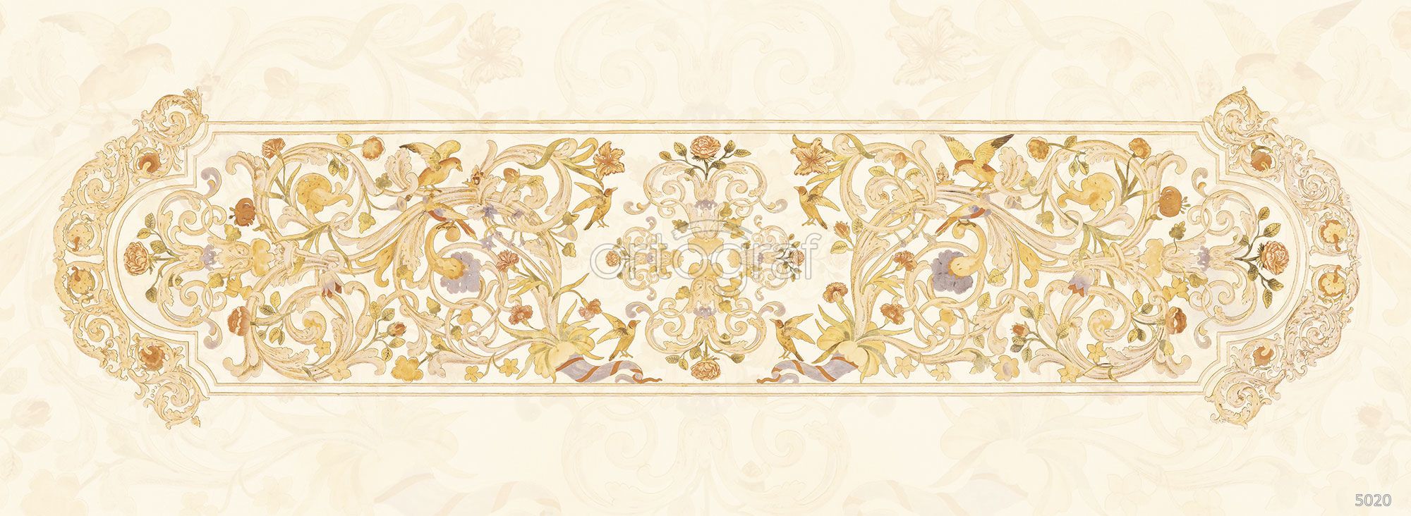 Узкая декоративная композиция с классическим орнаментом, переплетёнными цветами и птицами создаёт изысканное и утончённое настроение. Такой рисунок отлично подчёркивает элегантность пространства и добавляет нотки аристократического уюта. Хорошо подходит для оформления в классическом или романтичном стиле.