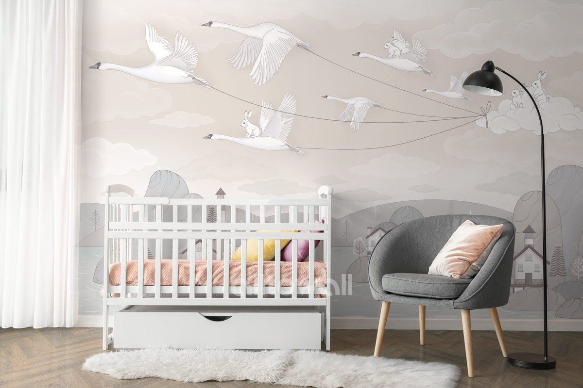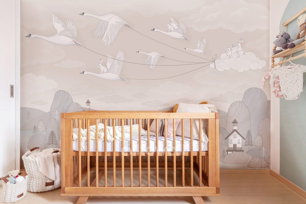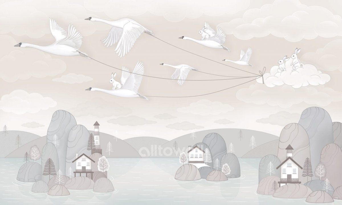 Светлые обои для детской комнаты мальчика или девочки. «Озёрный край-1» — сюжет с волшебной историей о зайчатах, которые отправились в путешествие вместе с перелётными птицами.