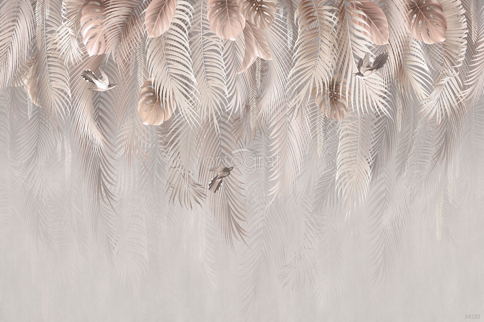 Изящные пальмовые листья и легкие силуэты птиц создают атмосферу уюта и воздушности, напоминая о спокойных тропических вечерах. Такой рисунок добавит интерьеру мягкости и элегантности, подойдет для зон отдыха или современных светлых помещений. Особенно гармонично впишется в спальню, гостиную или офис, придавая пространству утонченность и ощущение покоя.