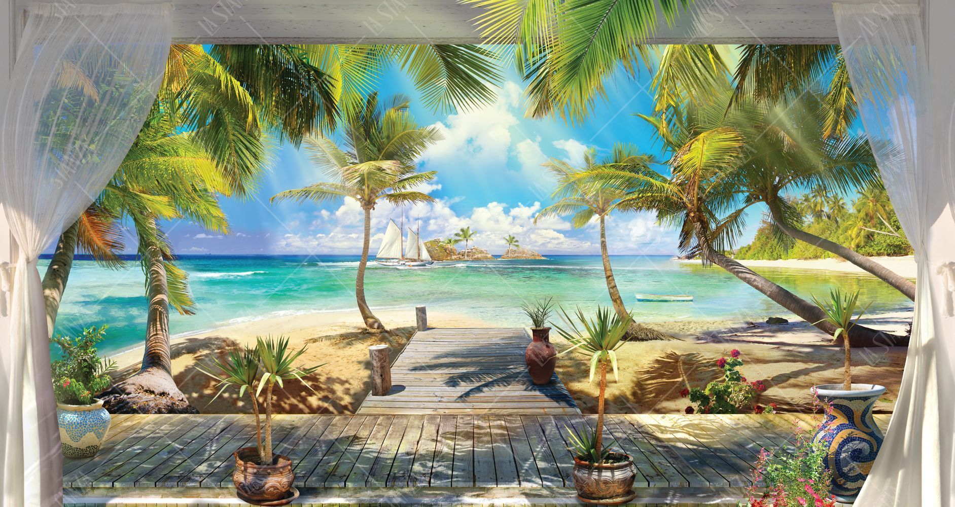 Фреска Панно море, шторы, пальмы, пляж
