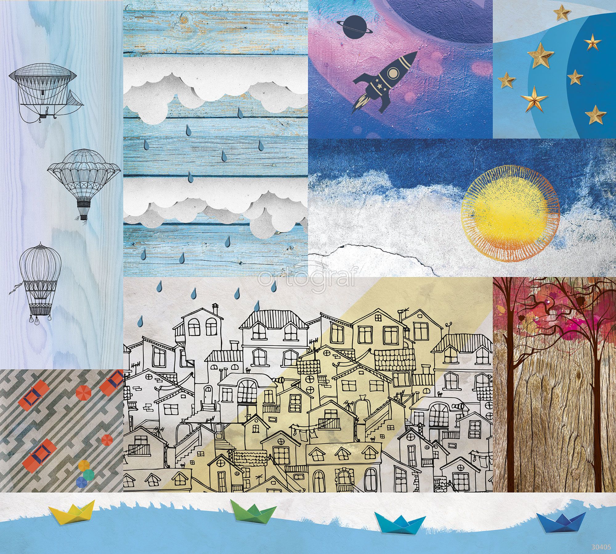 На изображении представлен декоративный коллаж из разрозненных сюжетов: фантазийные воздушные шары, капли дождя и облака, ракета и звёзды, стилизованный город с домами, абстрактный лес и бумажные лодочки на воде. Каждый элемент выполнен в разной технике, что создаёт атмосферу сказочного путешествия и детских фантазий.