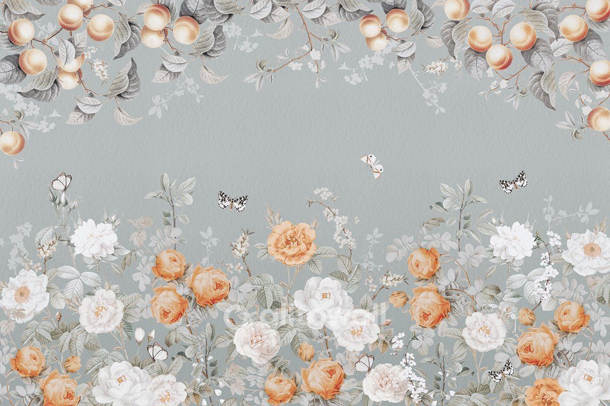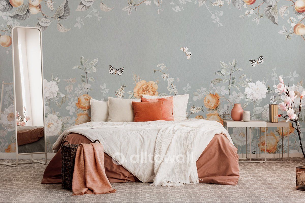 Романтичный сюжет в приглушённом серо-голубом оттенке с персиковыми деревьями, крупными бутонами и порхающими бабочками. «Персиковое настроение» — изящные обои для спальни, гостиной и комнаты подростка.