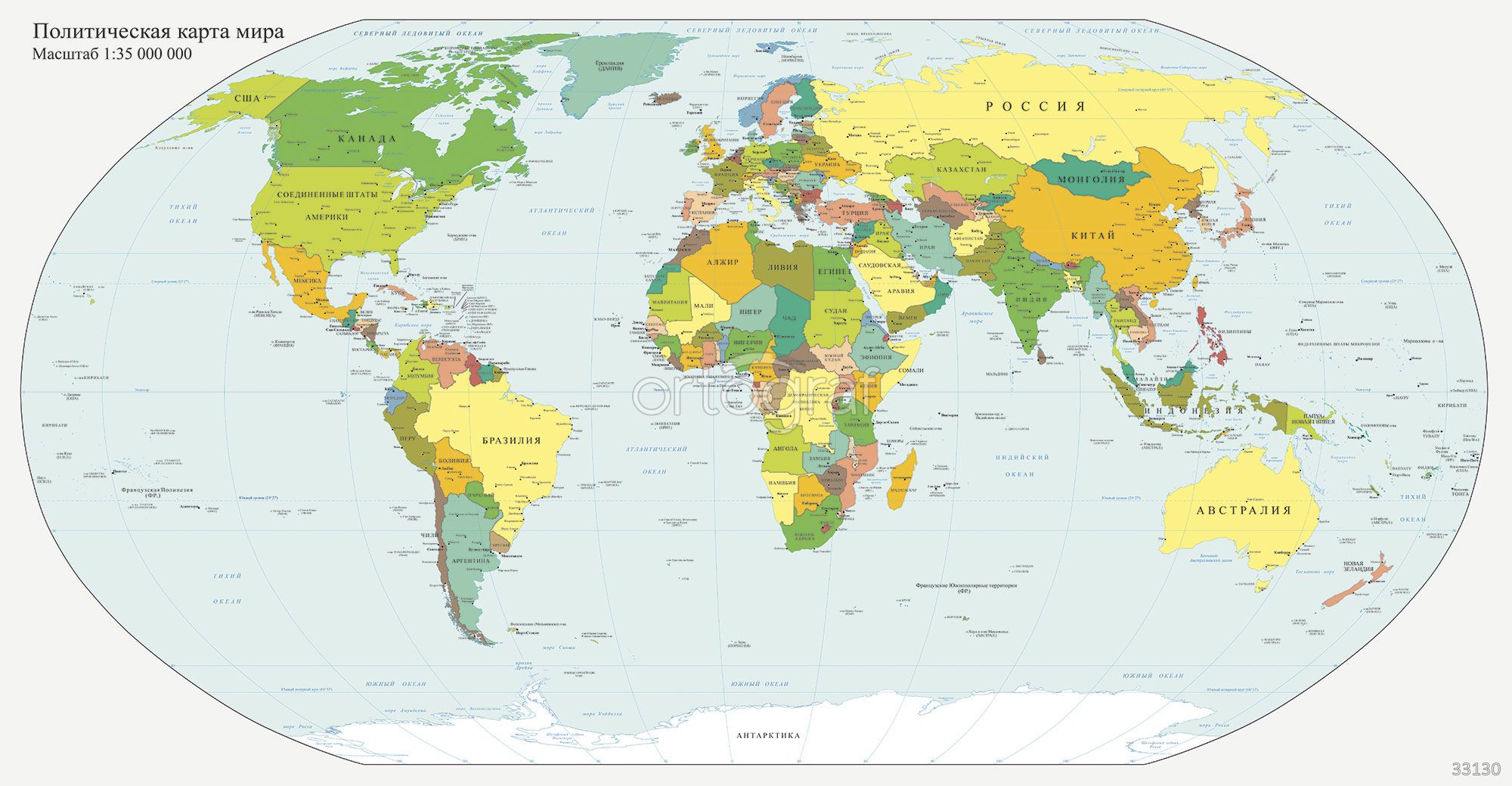 На изображении представлена политическая карта мира с границами стран, окрашенных в разные цвета, и подписями на русском языке. Этот вариант позволяет легко ориентироваться в расположении государств и столиц, а также помогает в изучении современной политической географии. Такая карта особенно уместна в образовательных и офисных пространствах.