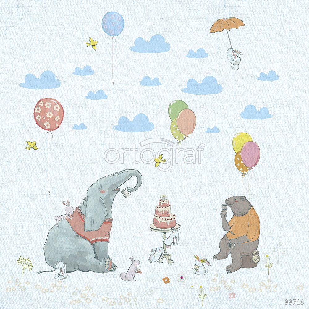 Добрая сценка с милыми животными, которые празднуют с тортом, воздушными шариками и облаками, создает атмосферу уюта, радости и праздника. Такой сюжет отлично впишется в интерьер детской комнаты, добавив ей волшебства и вдохновения для игр и творчества. Изображение идеально подходит для малышей, делая пространство теплым и приветливым.