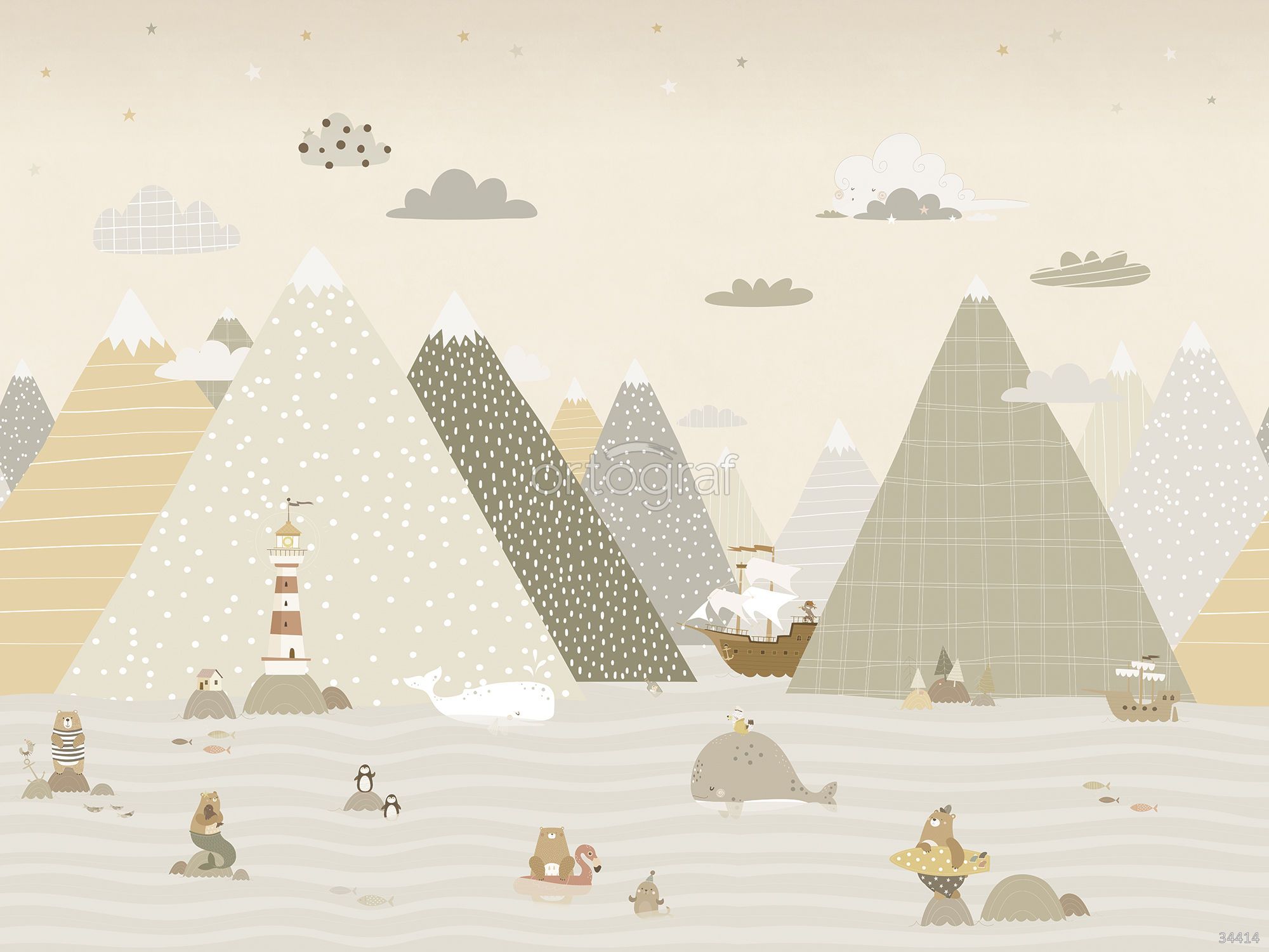 Сюжет наполнен морскими приключениями: среди гор, волн и облаков изображены киты, медведи, пингвины, маяк, корабли и маленькие домики. Иллюстрация насыщена деталями, создает атмосферу сказочного путешествия, отлично подходит для оформления пространства, где важна игровая и мечтательная среда. Такой рисунок гармонично впишется в интерьер с упором на фантазию и позитив.