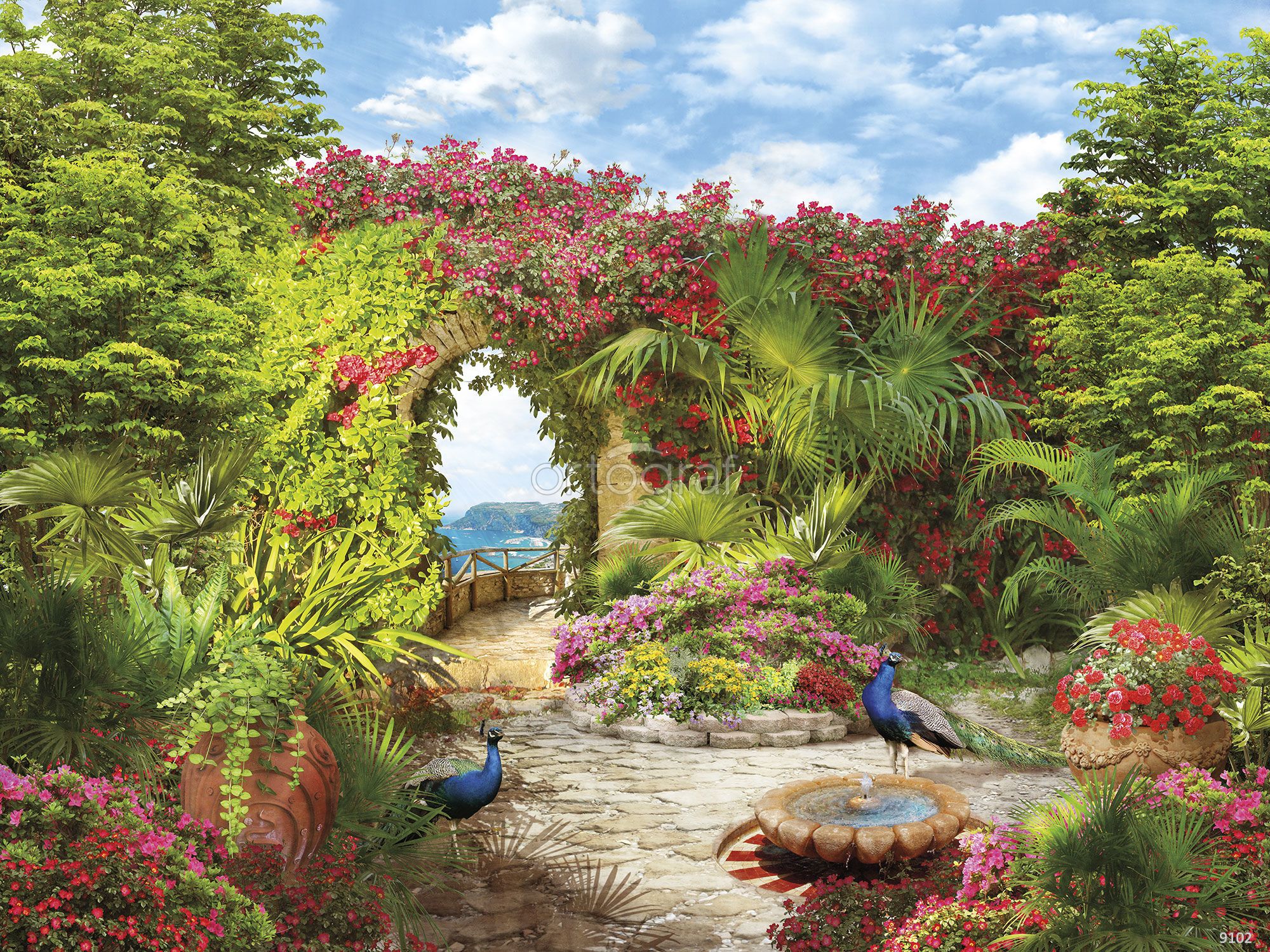 Пейзаж с пышной зеленью, аркой, увитой цветущими растениями, декоративными вазонами и двумя павлинами у небольшого фонтана перед видом на море. Такая композиция добавит в интерьер нотки экзотики, свежести и насыщенности, создавая атмосферу отдыха на природе. Наилучшим образом подойдет для помещений, где хочется добавить ощущение уюта и визуальной глубины.