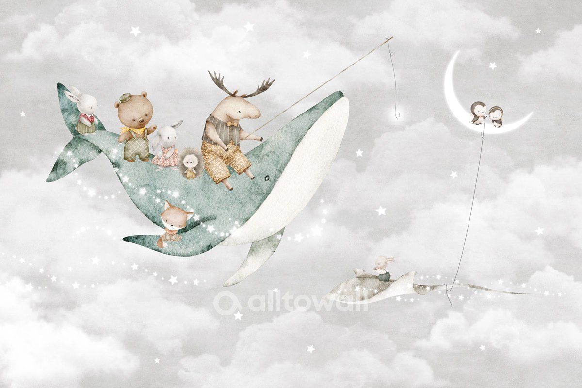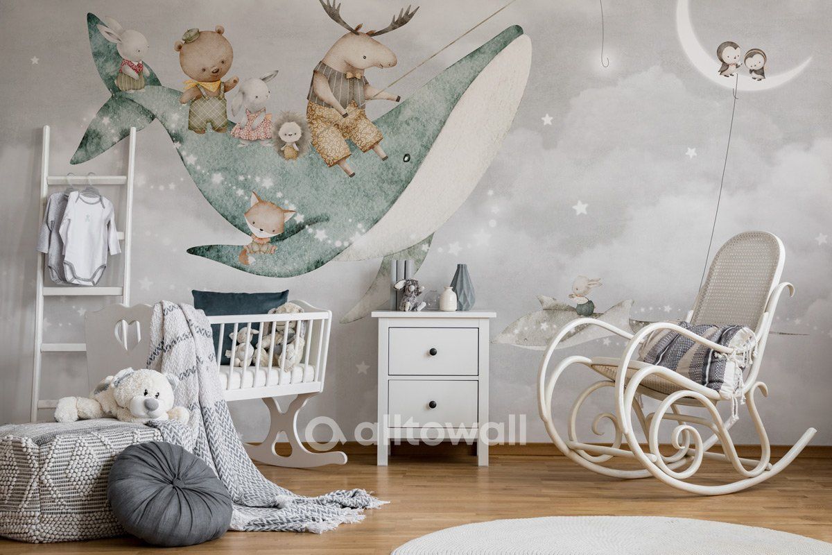 Прогулка под звёздами-1 – необычная модель для акцентного оформления спальной комнаты ребёнка от 2-3х лет. Это привлекающий внимание сюжет в виде сказочного кита, который неспешно парит в звёздном небе. На спине удобно устроились маленькие путешественники – ёжик, лисичка, медвежонок, лось и зайчики. Вокруг наблюдаются россыпи сверкающих серебряных звёзд и тонкий серп молодой Луны.