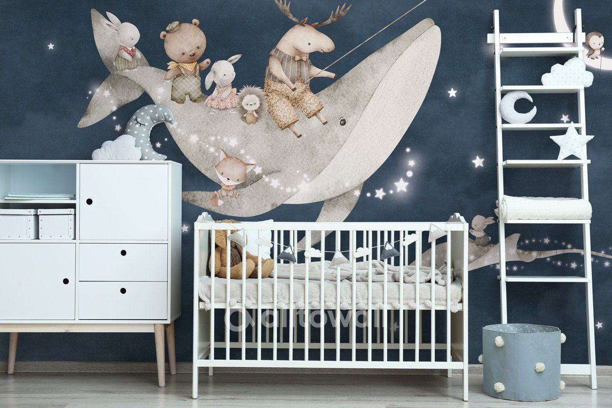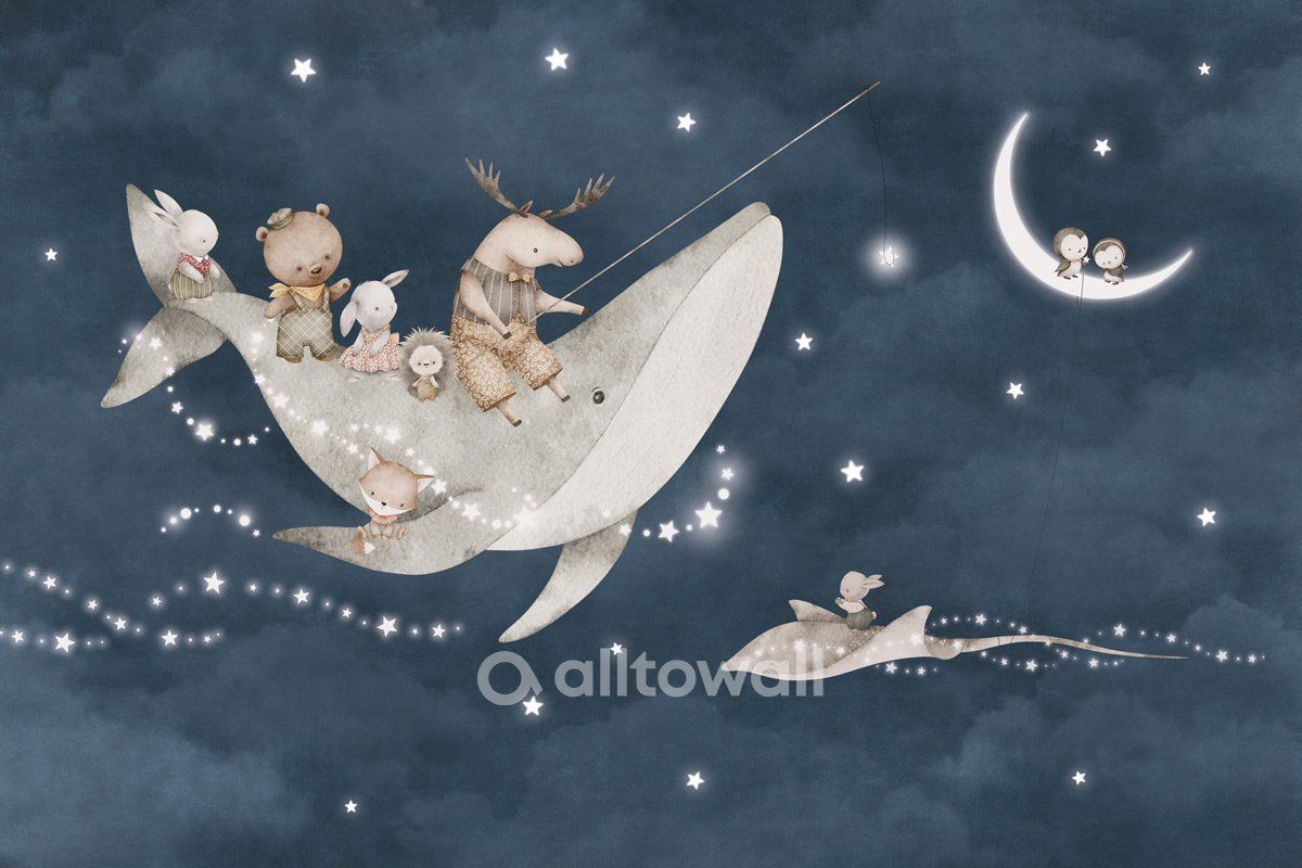 Прогулка под звёздами-2 – необычная модель для акцентного оформления комнаты ребёнка от 2-3х лет и старше. Это необычный и привлекающий внимание сюжет в виде сказочного кита, парящего в звёздном небе. На спине и плавниках кита удобно устроились маленькие путешественники – ёжик, лисичка, медвежонок, лось и зайчики.