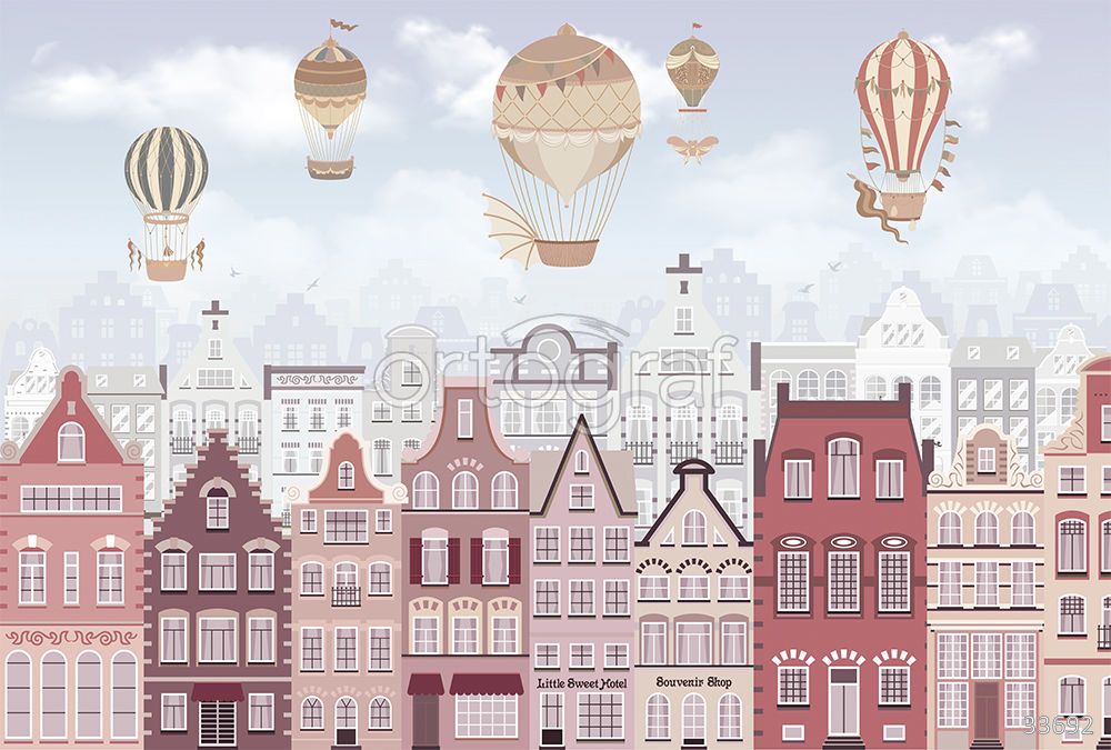 Городская панорама с уютными домиками, воздушными шарами и деревьями создает атмосферу европейского городка и уюта. Такой сюжет наполняет пространство легкостью и плавными линиями, подчеркивает стиль и отлично подойдет для детских, прихожей и коридора, а также для кухни. Рисунок идеально подойдет для современных и светлых интерьеров.
