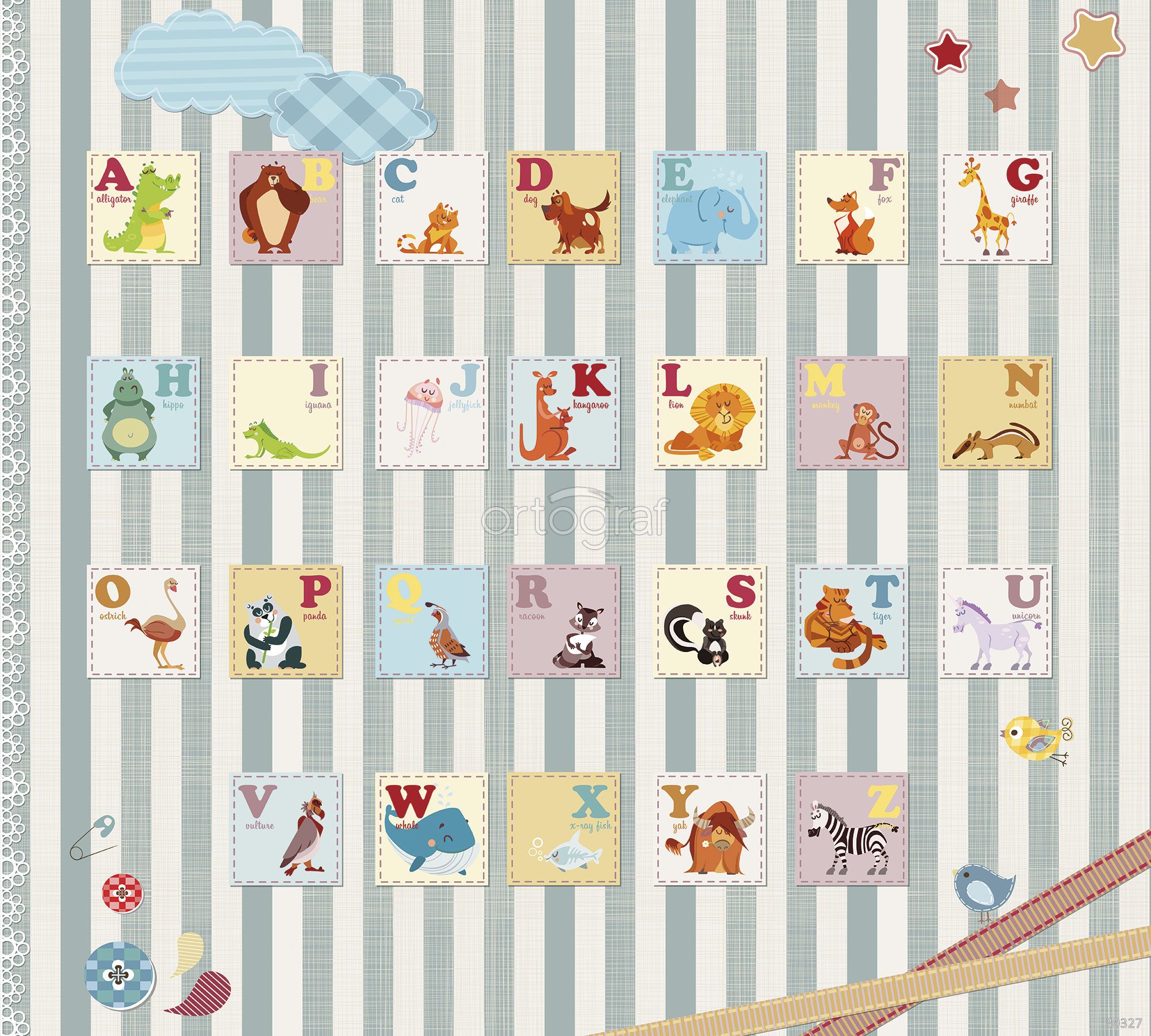 На изображении представлена яркая и декоративная азбука для детей, где для каждой буквы английского алфавита подобрано соответствующее животное. Каждая буква размещена на отдельной карточке с забавной иллюстрацией животного и его названием на английском языке. Карточки расположены на полосатом фоне в светлой мягкой цветовой гамме, что создает уютную и веселую атмосферу для обучения.