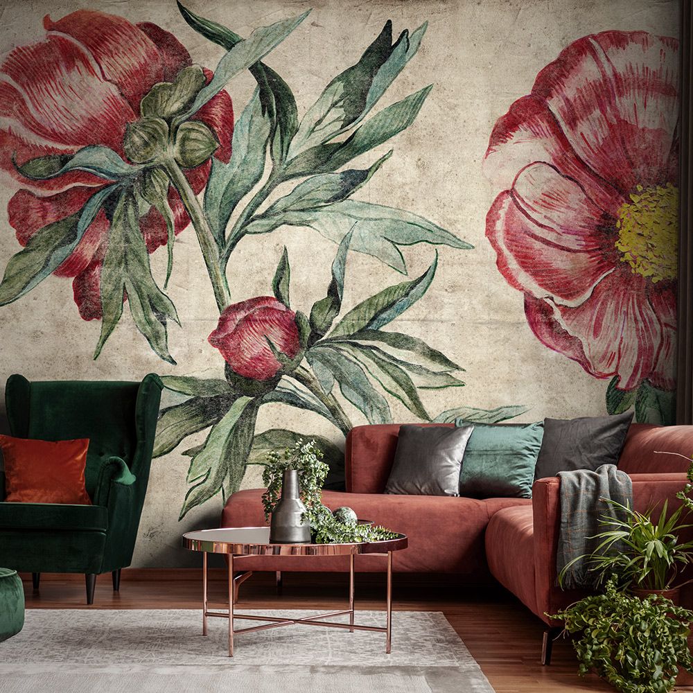 При выборе обоев с пионами лучше заказать текстильные бесшовные полотна, создающие эффект обтяжки комнаты без стыков. Это обеспечит особое очарование рисунку, придаст интерьеру больше гармонии. В каталоге можно выбрать разные расцветки покрытий: