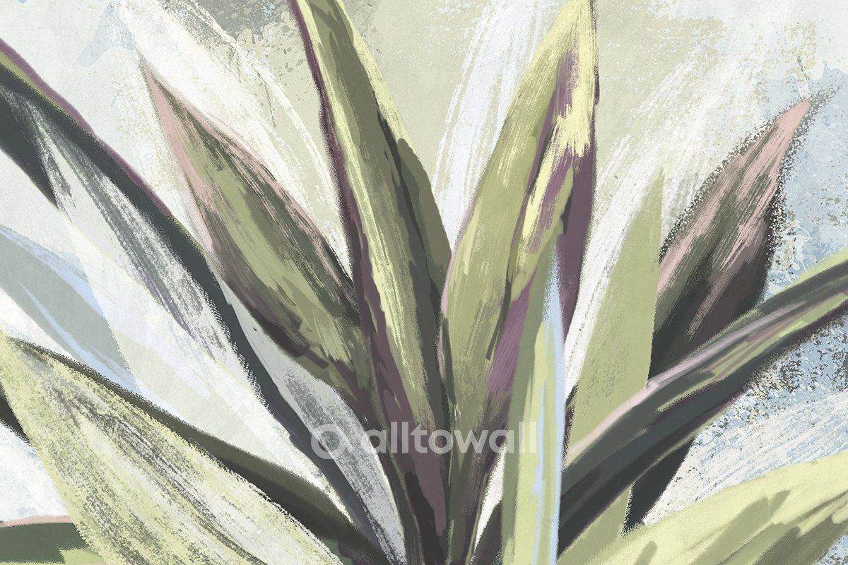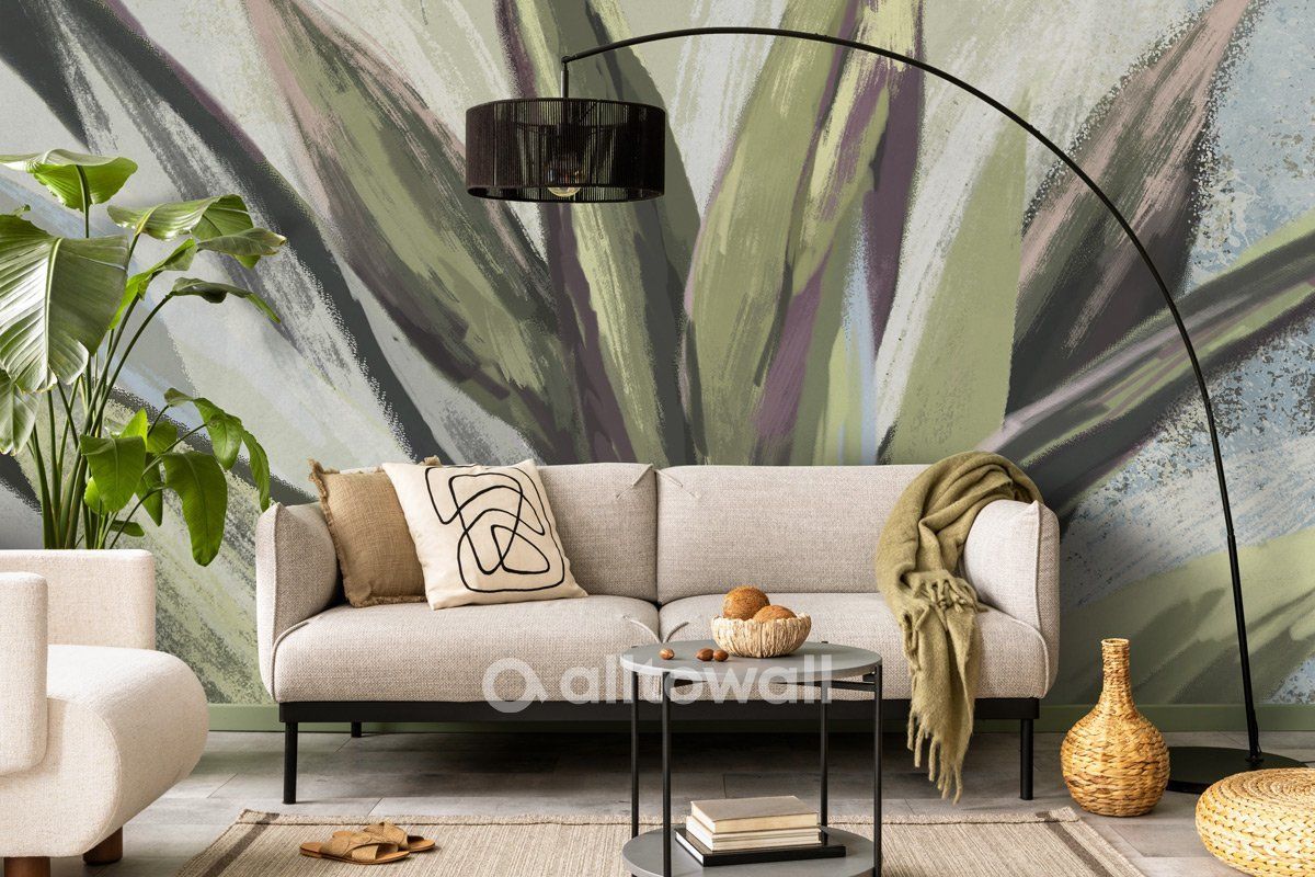 Обои с тропическим принтом, будто бы нарисованным масляными красками. «Рео» — красочный сюжет в зелёных тонах для спальни и гостиной.