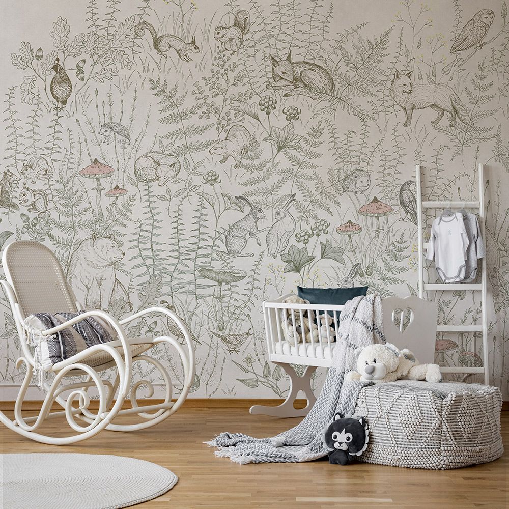 SCANDIFOREST – обои, разработанные для детских спален и отличающиеся дизайном в стиле простого рисунка, выполненного мелом. Основной сюжет – стилизованный скандинавский лет, где среди деревьев и трав можно увидеть лесных обитателей. Вот на поляне сидит медведь и обозревает окрестности, рядом в траве играют зайцы, на солнце нежится лисица. По ветвям скачут резвые белки, в траве прячутся птицы.