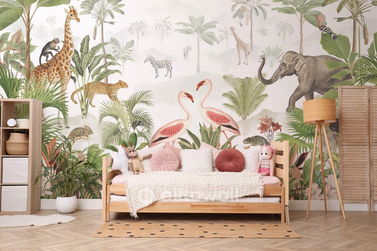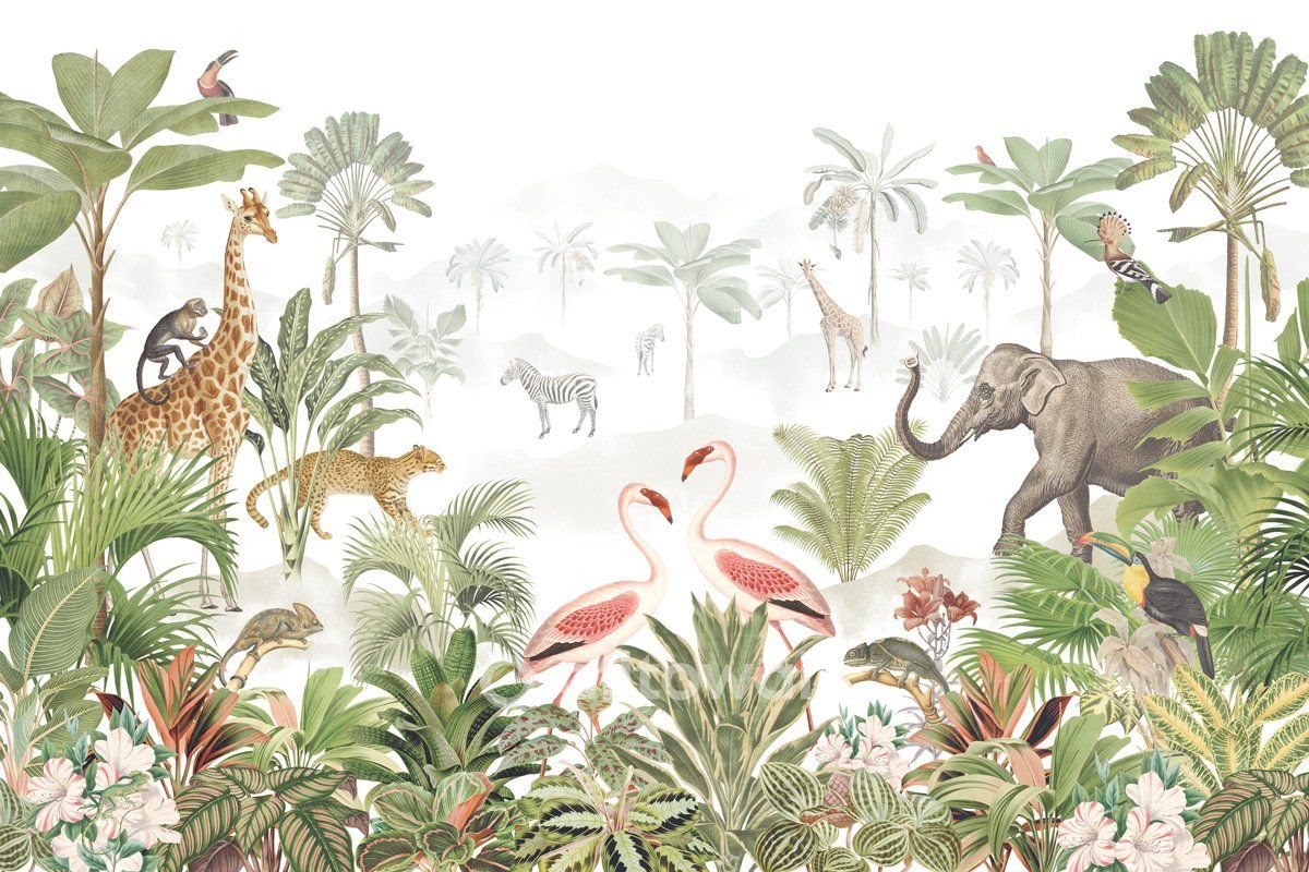 Сердце саванны – серия покрытий, посвящённых природным сюжетам. Это африканские джунгли, среди зарослей которых прогуливаются слоны, жирафы и экзотические птицы. Яркие краски и умиротворяющие изображения делают обои оптимальным решением для детской комнаты, выполненной в стиле Тропики или Эко.