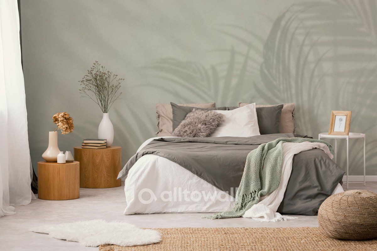 Обои в нежном фисташковом оттенке с тенью от пальм. Сюжет «SHADOWS Palm» будет хорошо смотреться в спальне или гостиной. Он напомнит вам о беззаботном лете и приятных моментах.