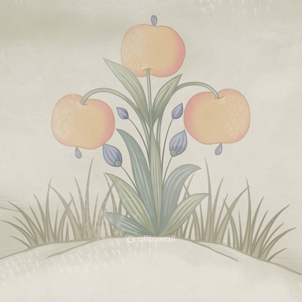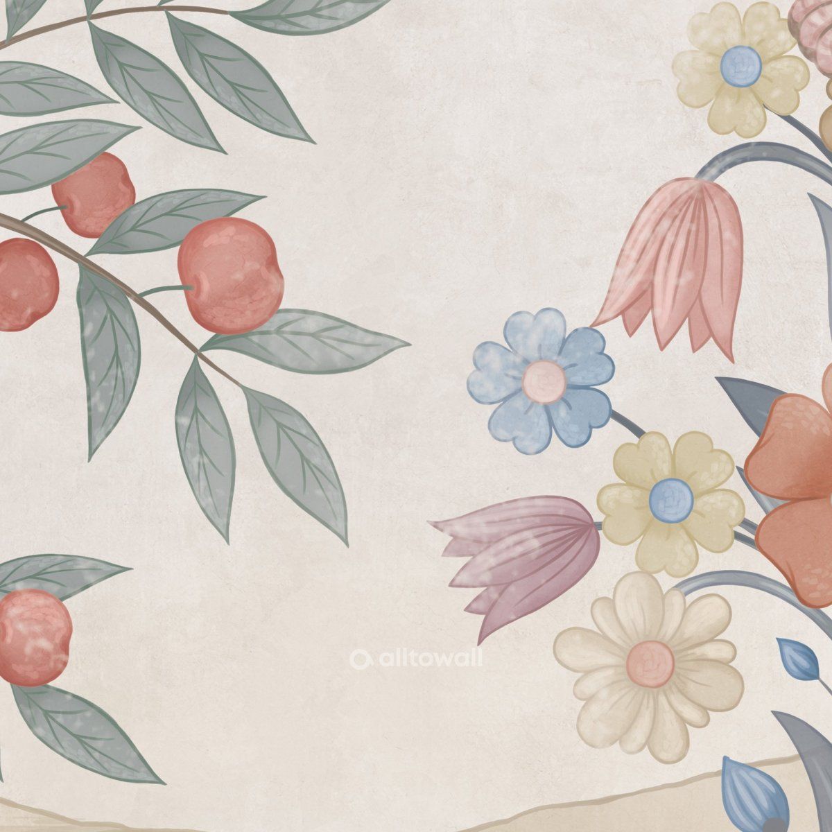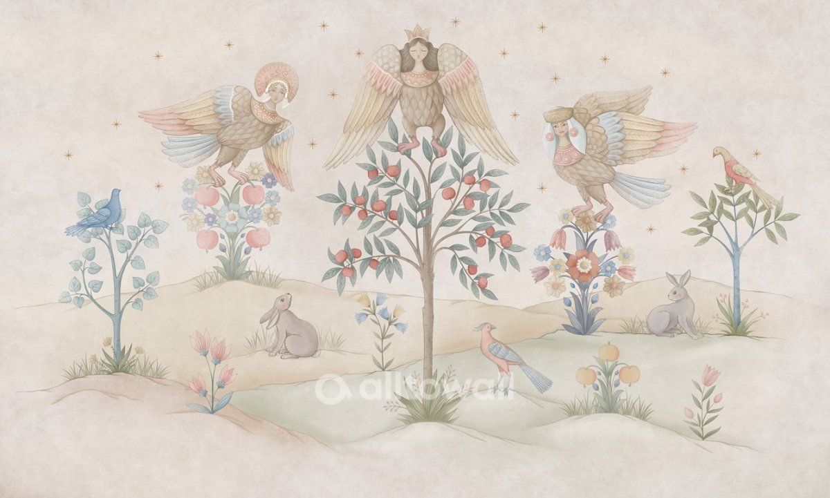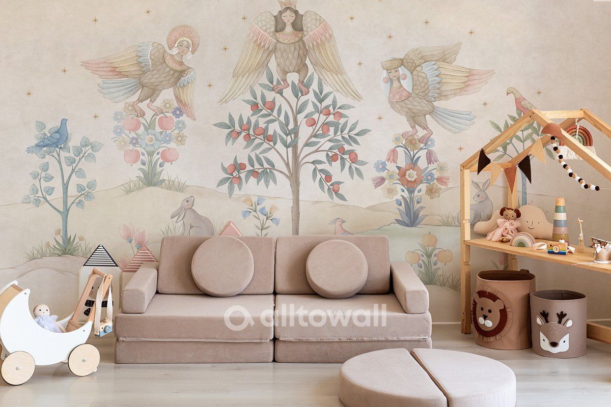 Фантазийный принт по мотивам русских народных сказок. Обои, с изображением плодовых деревьев и красных девиц в образах сказочных птиц, украсят комнату ребёнка и напомнят о любимых книгах из детства.