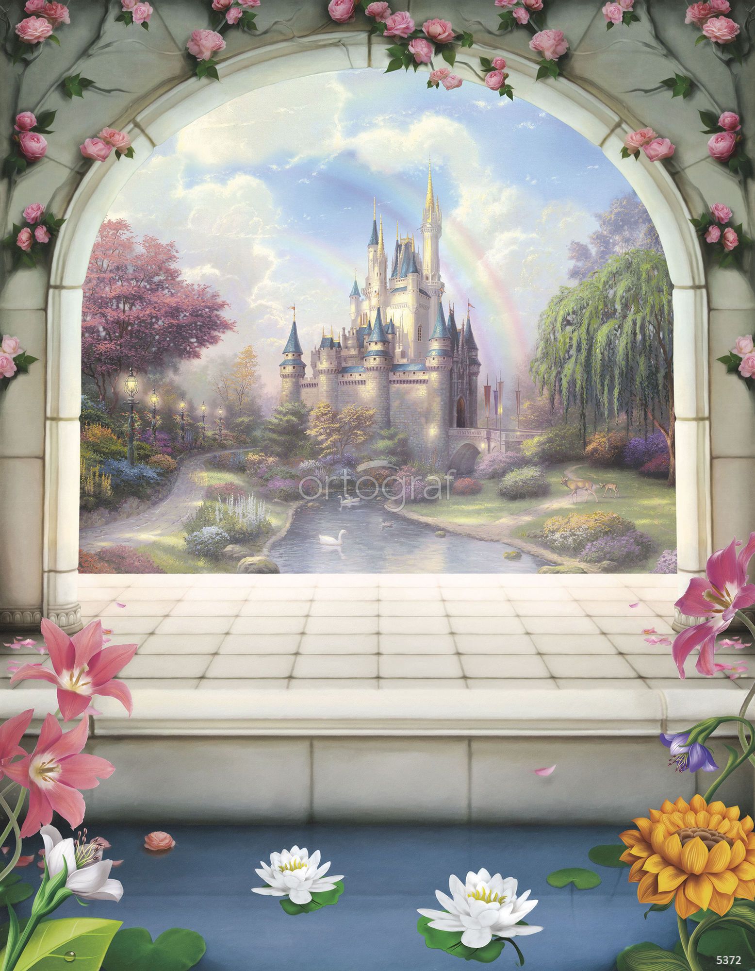 Сюжет переносит в сказочный мир — через цветочную арку открывается вид на волшебный замок с башнями, радугой, прудом с лилиями и ухоженным садом. Атмосфера напоминает иллюстрации к любимым сказкам и мультфильмам, идеально подходит для оформления детской, создавая вдохновение для игры и фантазии.