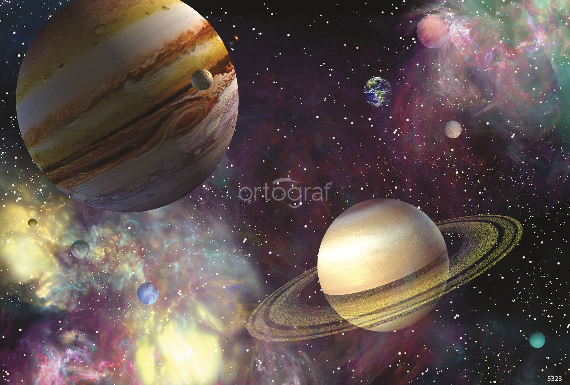 Изображение открывает фантастический вид на космос с крупными планетами, такими как Юпитер и Сатурн, окружёнными их спутниками и яркими звёздами на фоне туманностей и далёкой Земли. Такой космический сюжет идеально подойдёт для создания вдохновляющей атмосферы в детской, а также офисе или гостиной, особенно если интерьер оформлен в современном или обучающем стиле.