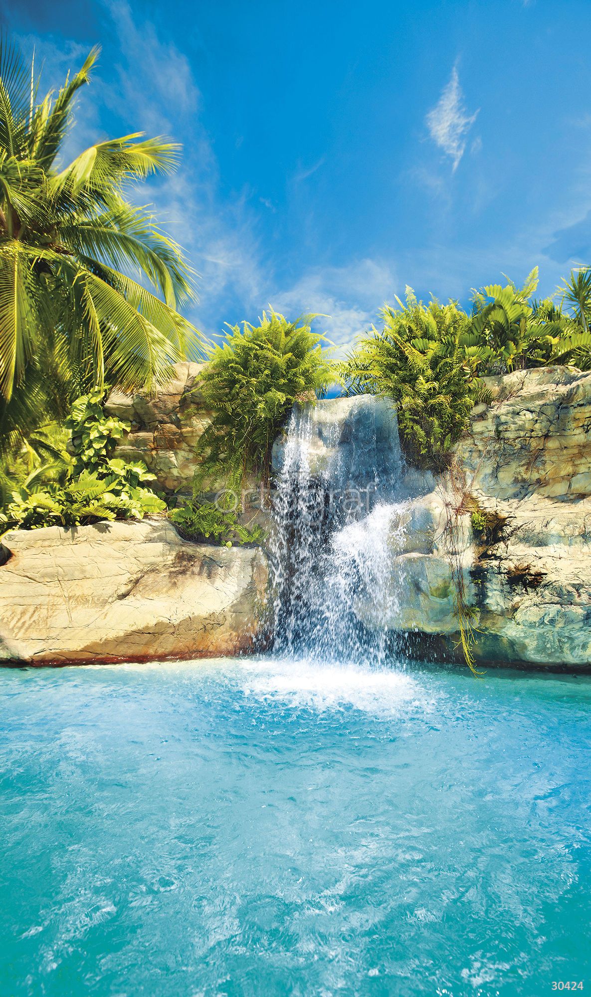 На изображении показан живописный водопад, стекающий с каменистого утёса в тихую лагуну, окружённую пышной тропической растительностью и пальмами. Сцена создаёт атмосферу уединённого райского уголка, притягивающего свежестью, спокойствием и гармонией с природой.