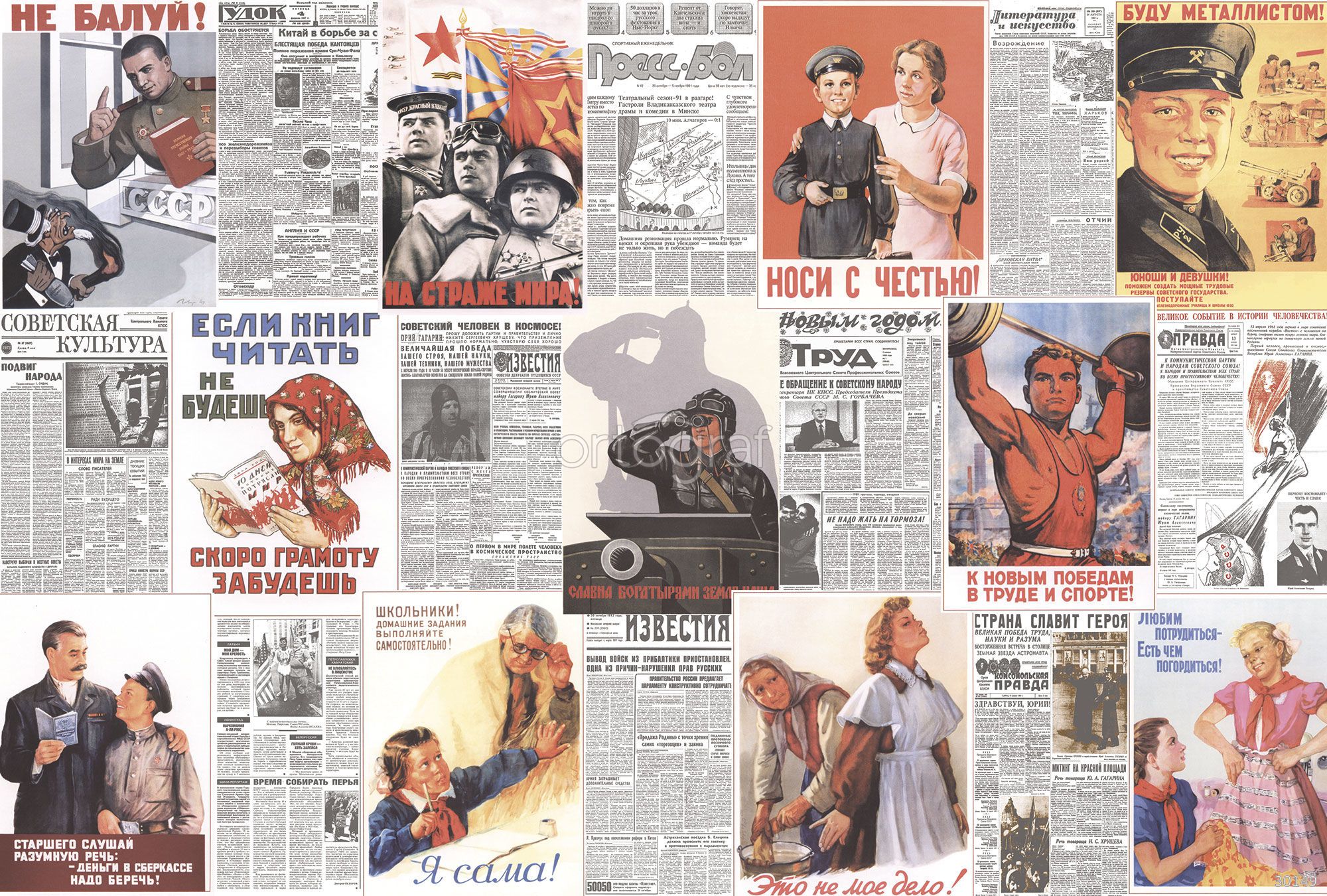 На изображении представлен тематический коллаж, выполненный в стиле советской пропаганды: на фоне множества газетных страниц и полос советских изданий размещены агитационные плакаты с выразительными персонажами, сценами трудовой, учебной и патриотической жизни. Комбинация визуальных образов и газетных текстов создаёт атмосферу советской эпохи, отражая идеалы гражданской ответственности, труда, спорта, дисциплины и чтения.