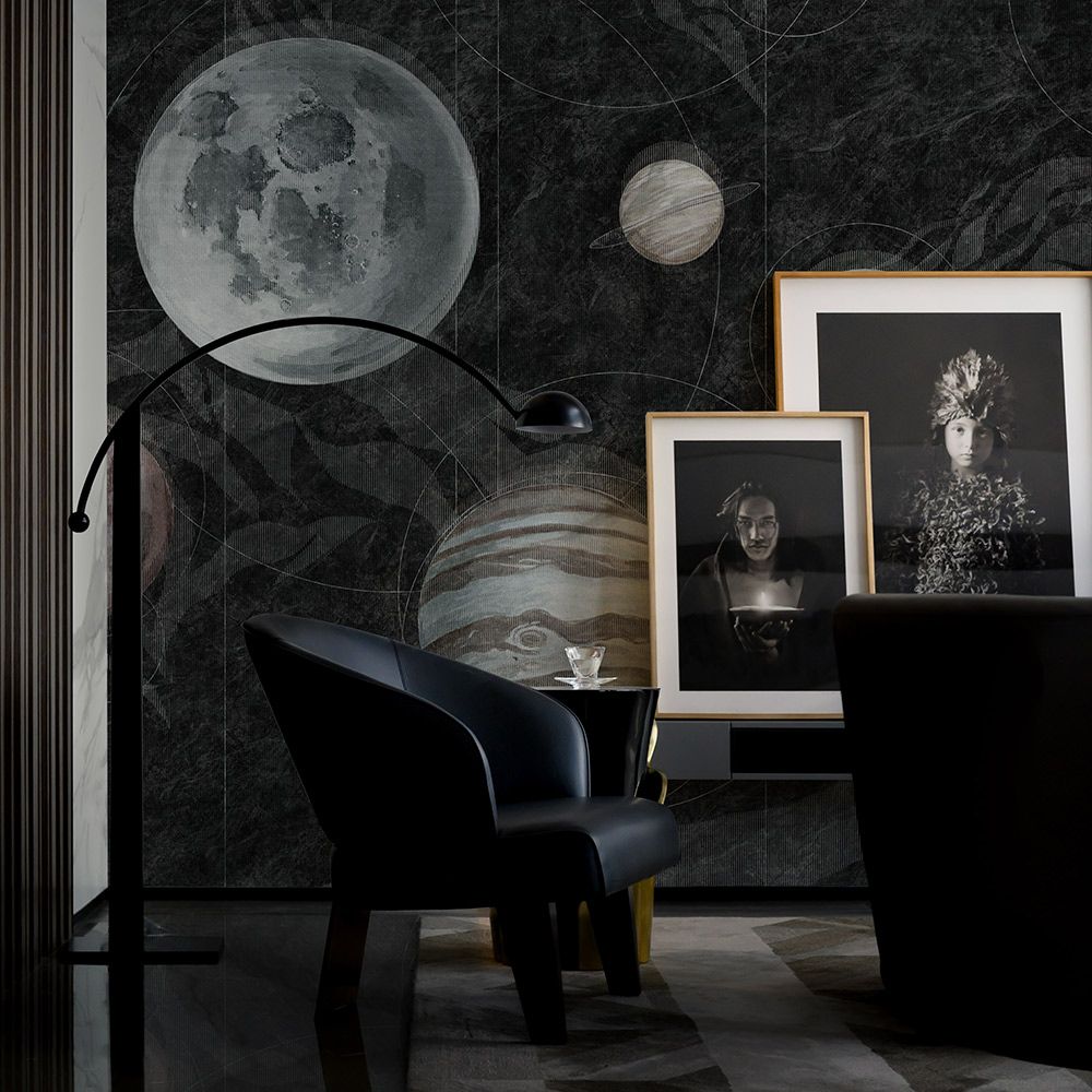 Покрытия представлены в нескольких вариантах – классические темные, в черно-белом исполнении или с необычным светлым фоном. Для отделки помещений с использованием обоев SPACE можно выбрать такие варианты: