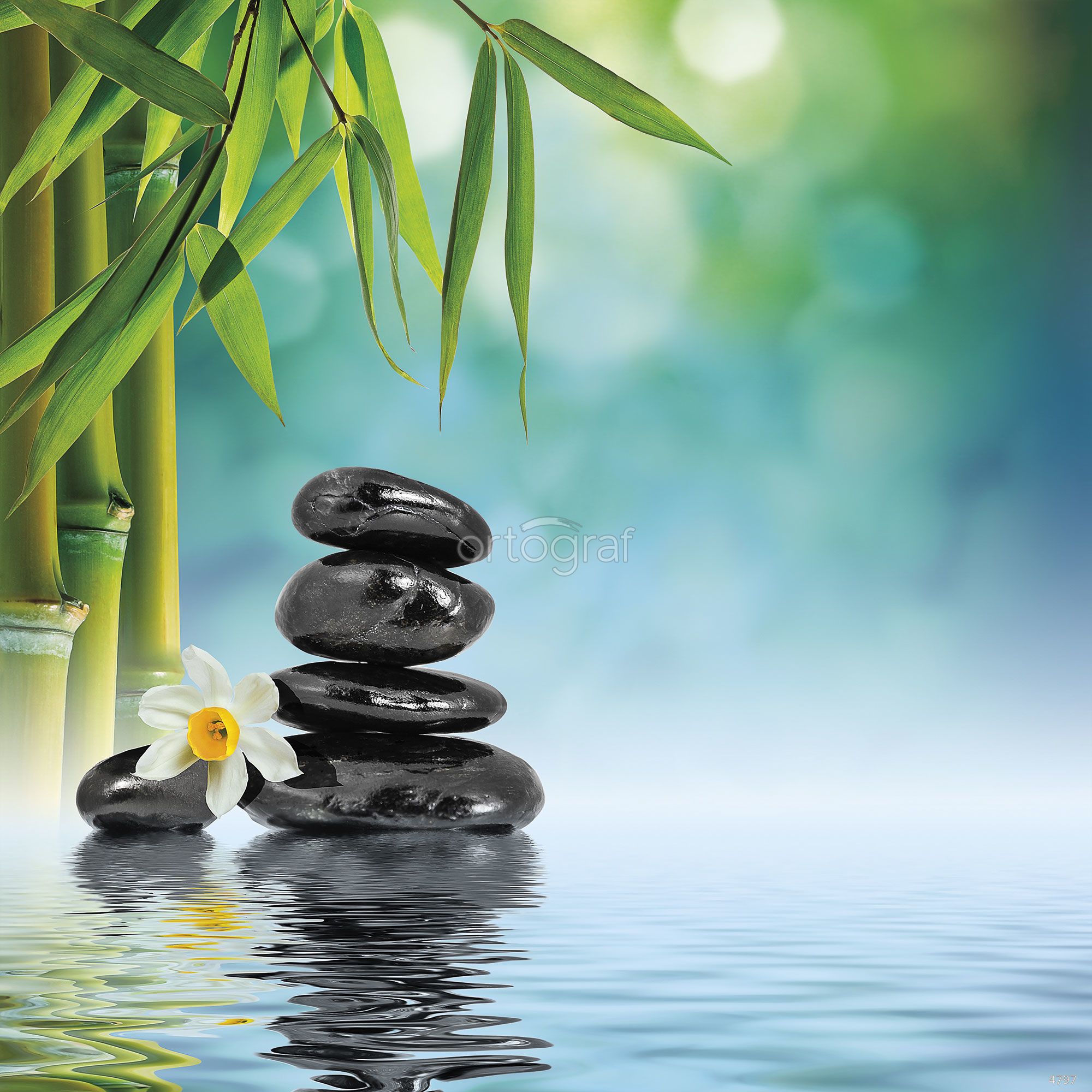 Композиция с бамбуком, гладкими камнями, цветком и отражением в воде навевает ощущение спокойствия, уюта и гармонии, подходящей для создания атмосферы релаксации. Такой сюжет отлично подойдет для помещений, связанных с отдыхом и восстановлением, а также для мест, где хочется подчеркнуть чистоту и свежесть пространства.