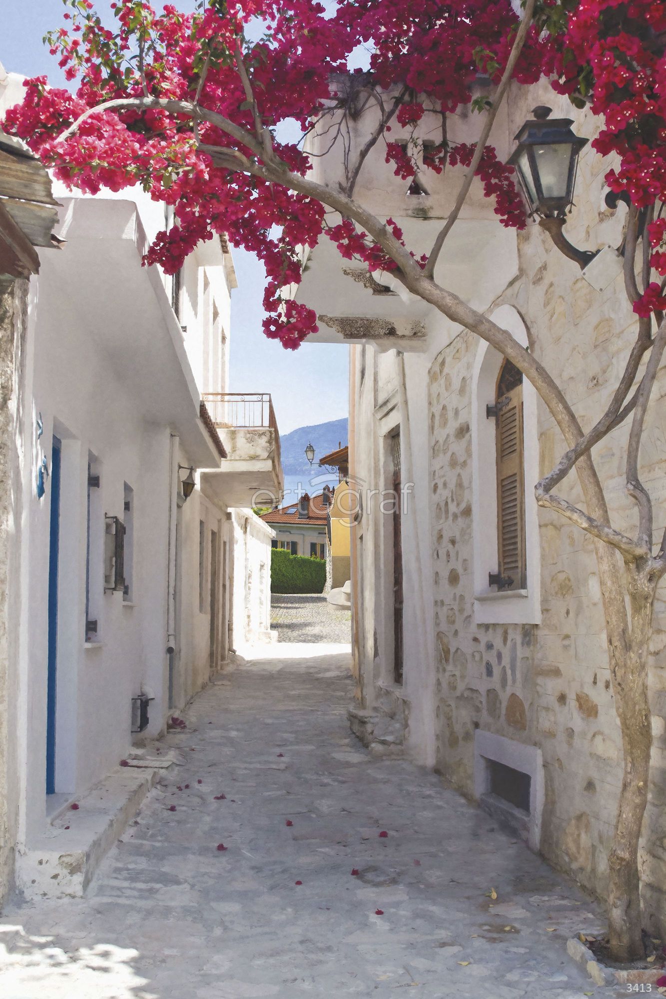Атмосферный дворик с узкой мощёной улочкой, светлыми фасадами домов и пышно цветущим деревом добавляет ощущение уюта, средиземноморского шарма и солнечного настроения. Такой сюжет отлично подходит для помещений, где хочется создать гостеприимную и расслабляющую атмосферу. Рекомендуется для оформления прихожей и коридора, кухни или гостиной.