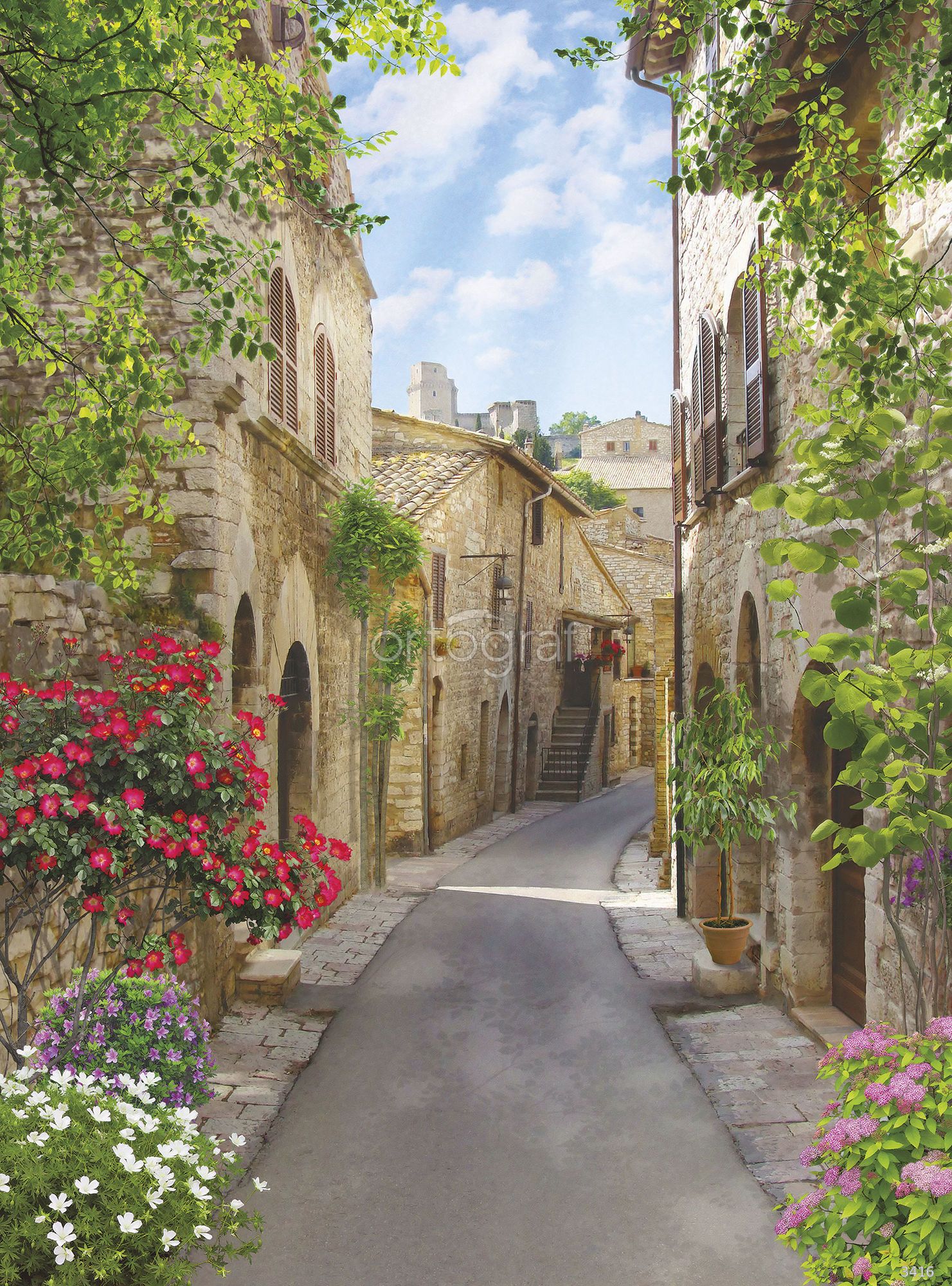 Изображение уютной улочки старинного европейского городка с каменными домами, арками и пышными цветущими растениями создает атмосферу теплоты и уюта. Такой сюжет добавляет интерьеру ощущение путешествия и вдохновения, делая пространство визуально интересным и гостеприимным. Особенно подойдет для оформления зон отдыха, обеденных пространств или светлых гостиных.