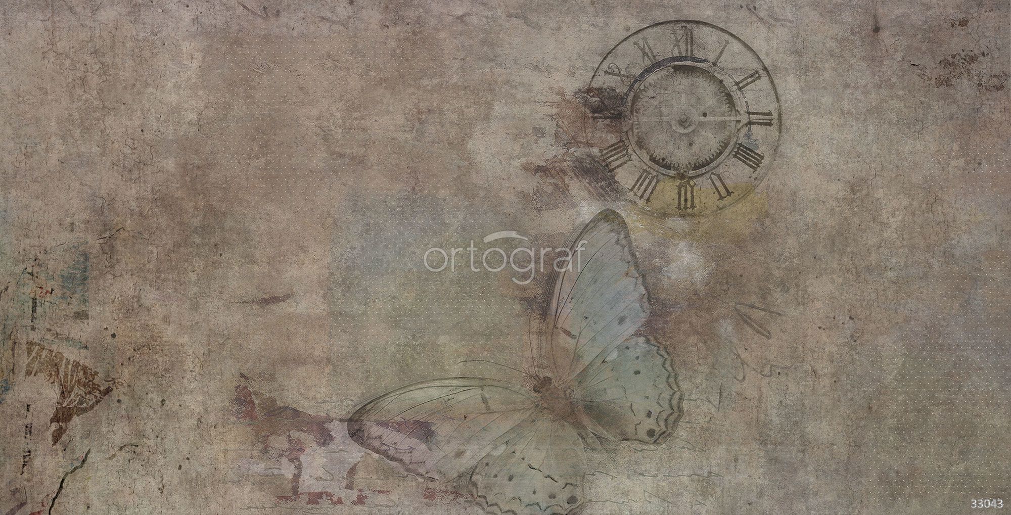 Фон с состаренным эффектом, изображением часов и крупной бабочки, создающим лёгкое ощущение винтажной мечтательности и романтики. Такой фон гармоничен в современных и неоклассических пространствах для создания спокойного настроя.
