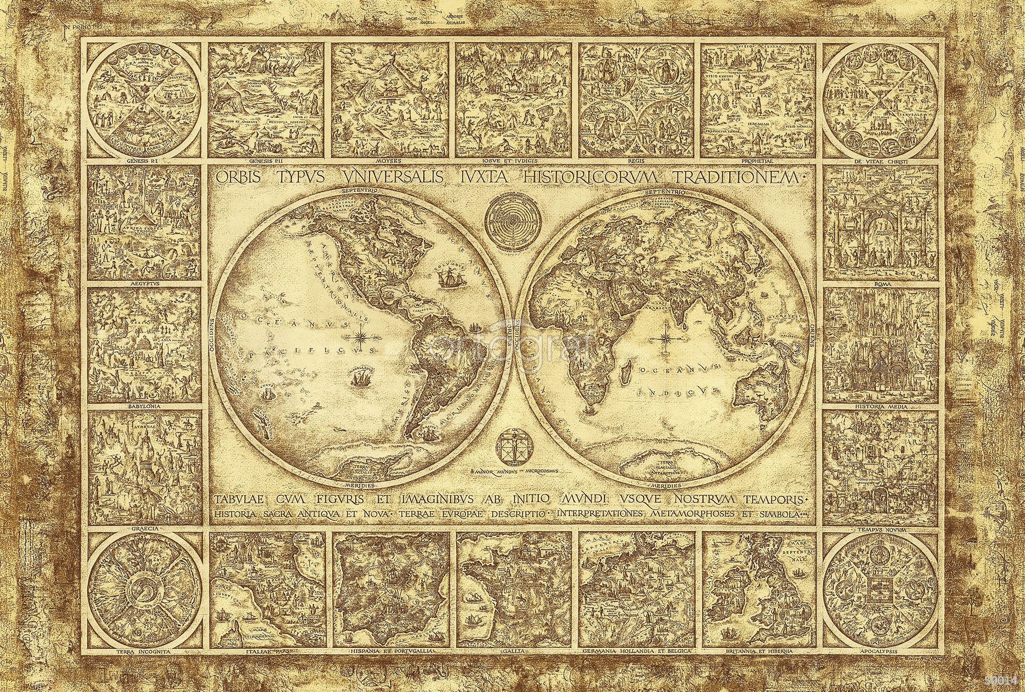 На изображении представлена антикварная карта мира с множеством исторических сюжетов и иллюстраций по краям, что придаёт ей атмосферу старинного кабинета и интеллектуального исследования. Этот сюжет идеально подойдёт для украшения офиса, гостиной, прихожей и коридора или столовой, добавляя пространству нотки элегантности и познавательности.