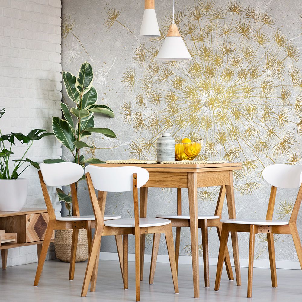 SUNSHINE – обои, сразу привлекающие внимание необычным дизайном. Основной акцент изображения сделан на стилизованном солнце, которое формируется из сотен тончайших пушинок весеннего одуванчика. Кажется, что малейшее дуновение ветерка заставит пушинки разлететься по комнате, принося с собой ароматы прогретого солнце и воздуха и распускающихся полевых цветов. Для тех, кто предпочитает необычные решения в интерьер, предлагается вариант с темным фоном, на котором головка одуванчика изображает серебристую или золотистую луну.