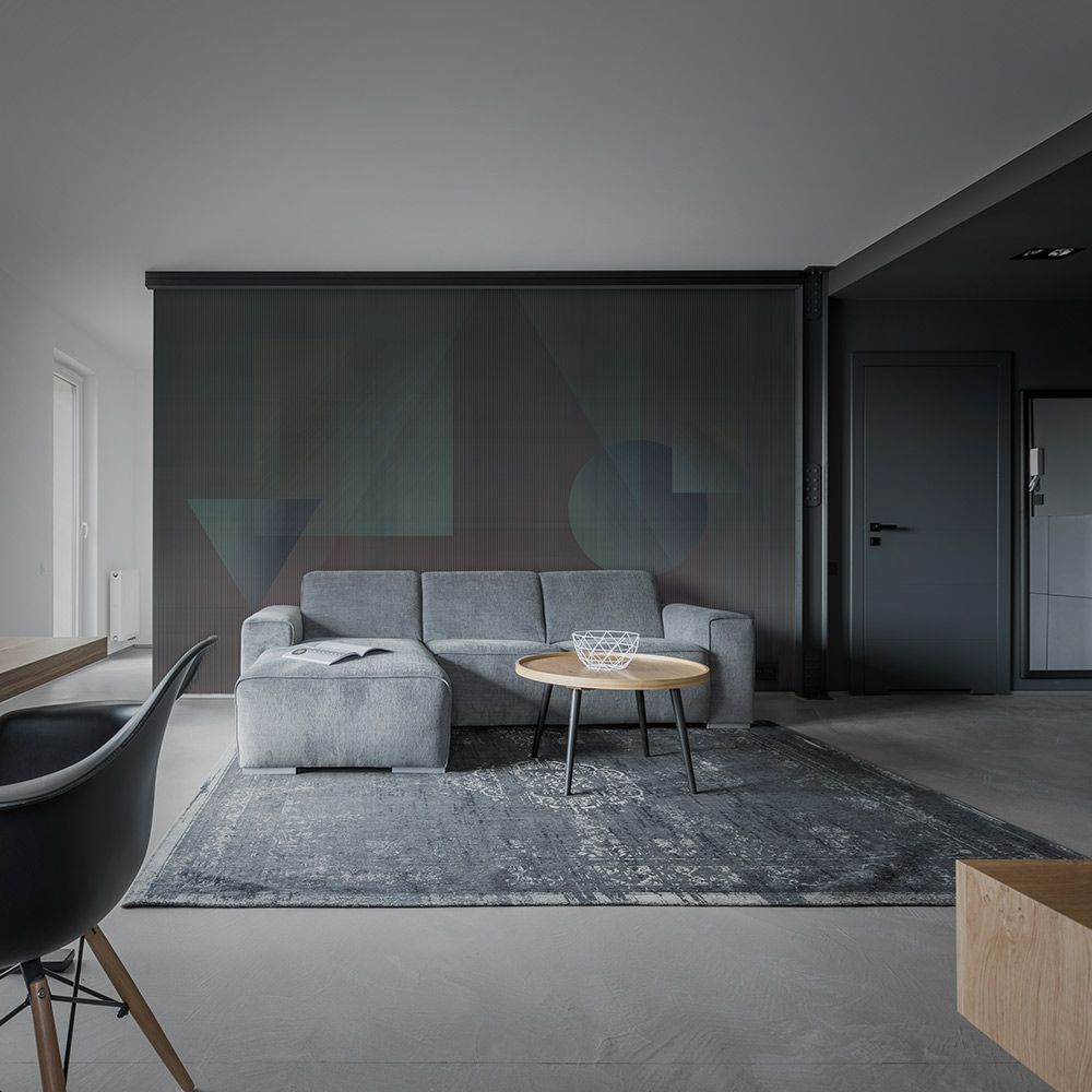 • стильный темный фон с едва уловимыми контурами геометрических фигур, которые пронизываются вертикальными линиями, такие покрытия станут интересной находкой для лаконичного интерьера в стиле Лофт или футуризм;