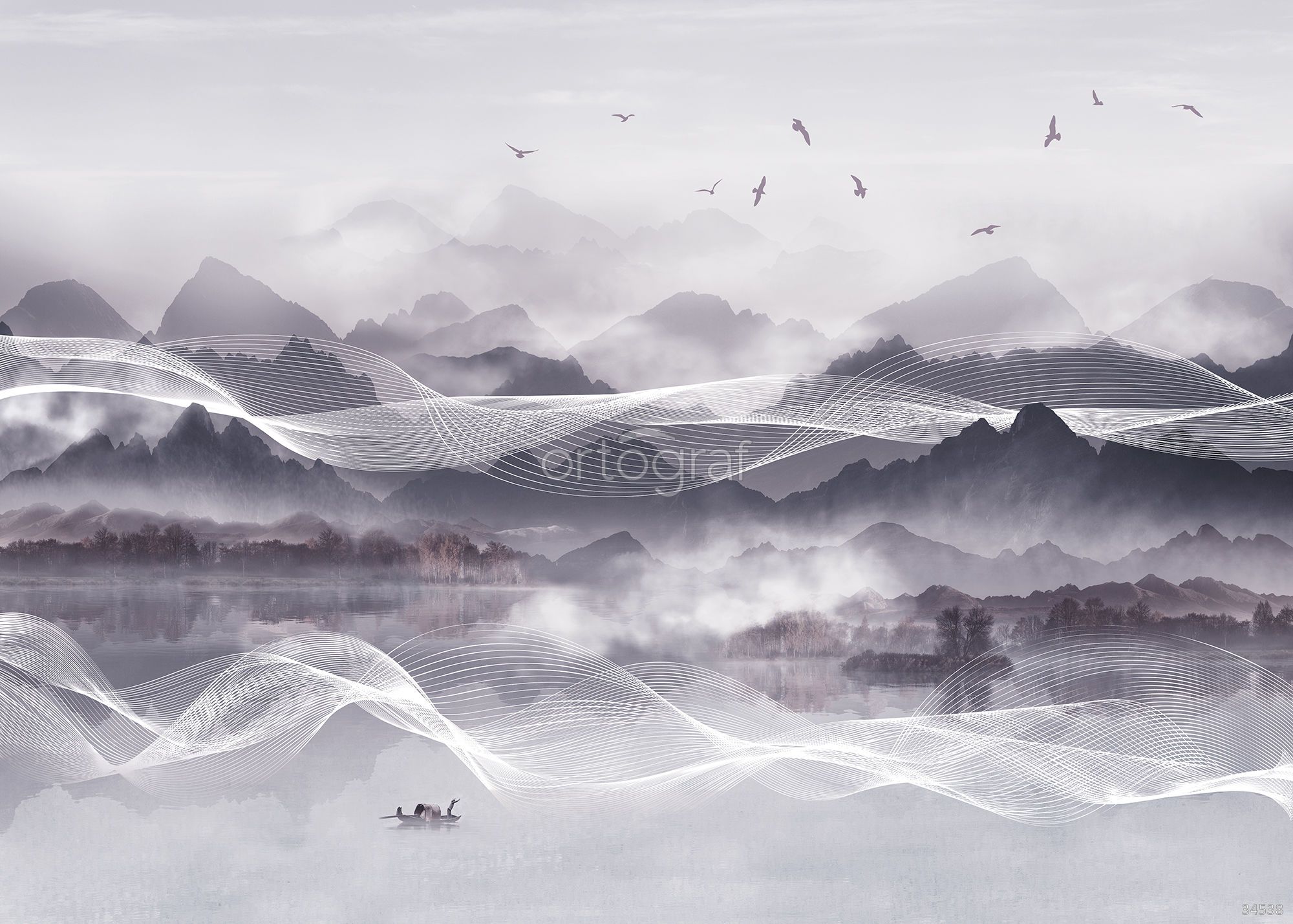 Художественный горный пейзаж с множеством силуэтов гор, отражением в воде, летящими птицами и абстрактными волнами создаёт атмосферу спокойствия и уравновешенности. Такой рисунок визуально расширяет пространство и добавляет ему глубины, отлично подходя для зон отдыха и работы, где важен настрой на гармонию и вдохновение. Композиция подходит для оформления современного и элегантного интерьера.