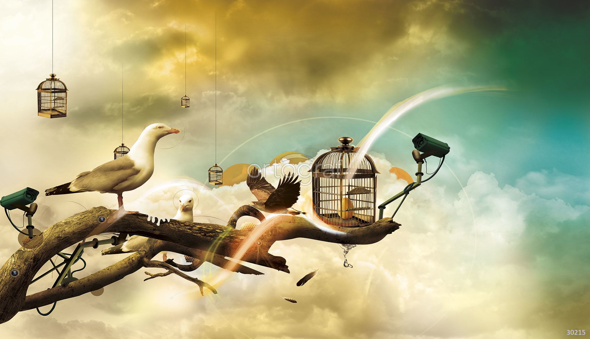 На изображении показана сюрреалистическая сцена: чайки сидят на ветках, которые оборудованы видеокамерами слежения, а вокруг парят пустые птичьи клетки. На ярком фоне неба с облаками ощущается сочетание свободы, наблюдения и загадочного движения.