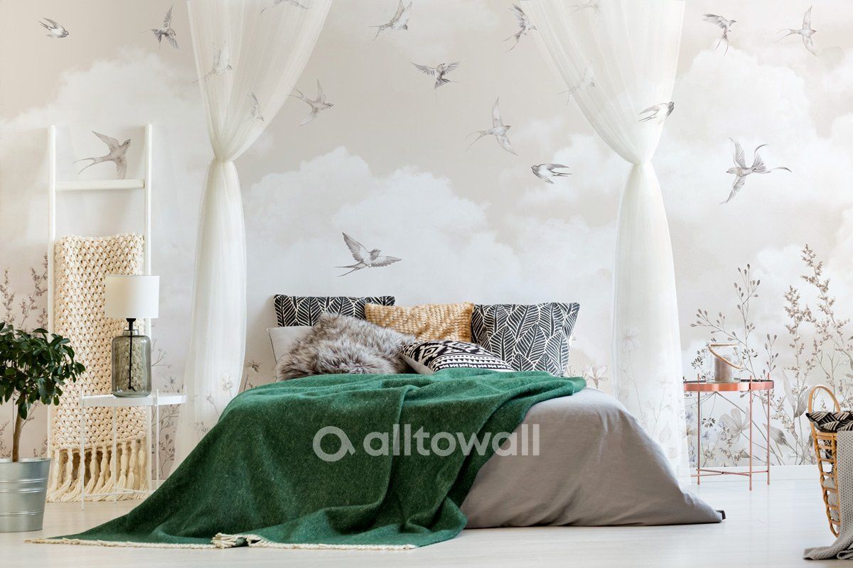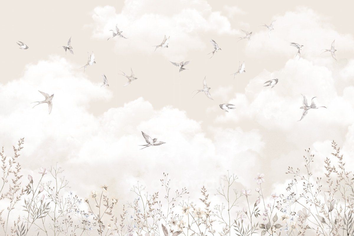 Пудровые обои со стаей ласточек, парящих над цветущим полем. «Танец ласточек-2» — нежный сюжет в акварельной технике для спальни, гостиной или детской комнаты девочки.