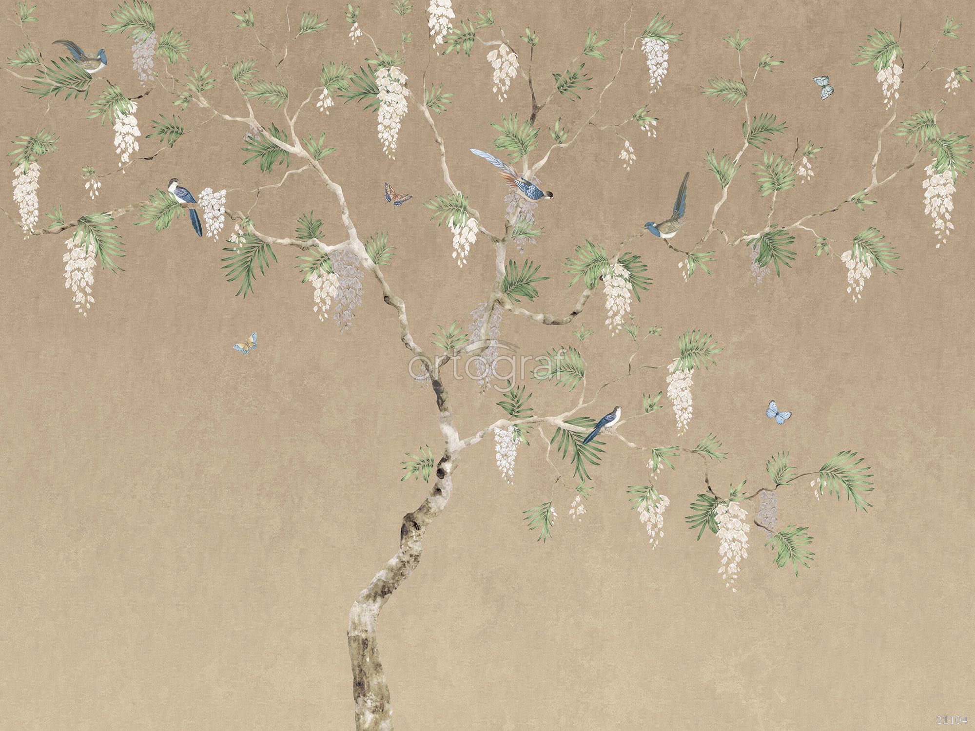 Сюжетные обои изображают ветвистое дерево с гроздьями изящных соцветий, среди которых сидят мелкие певчие птицы. На ветках и возле кроны порхают бабочки, на переднем плане видны травы и полевые растения, что создаёт ощущение спокойствия, гармонии с природой и лёгкости.