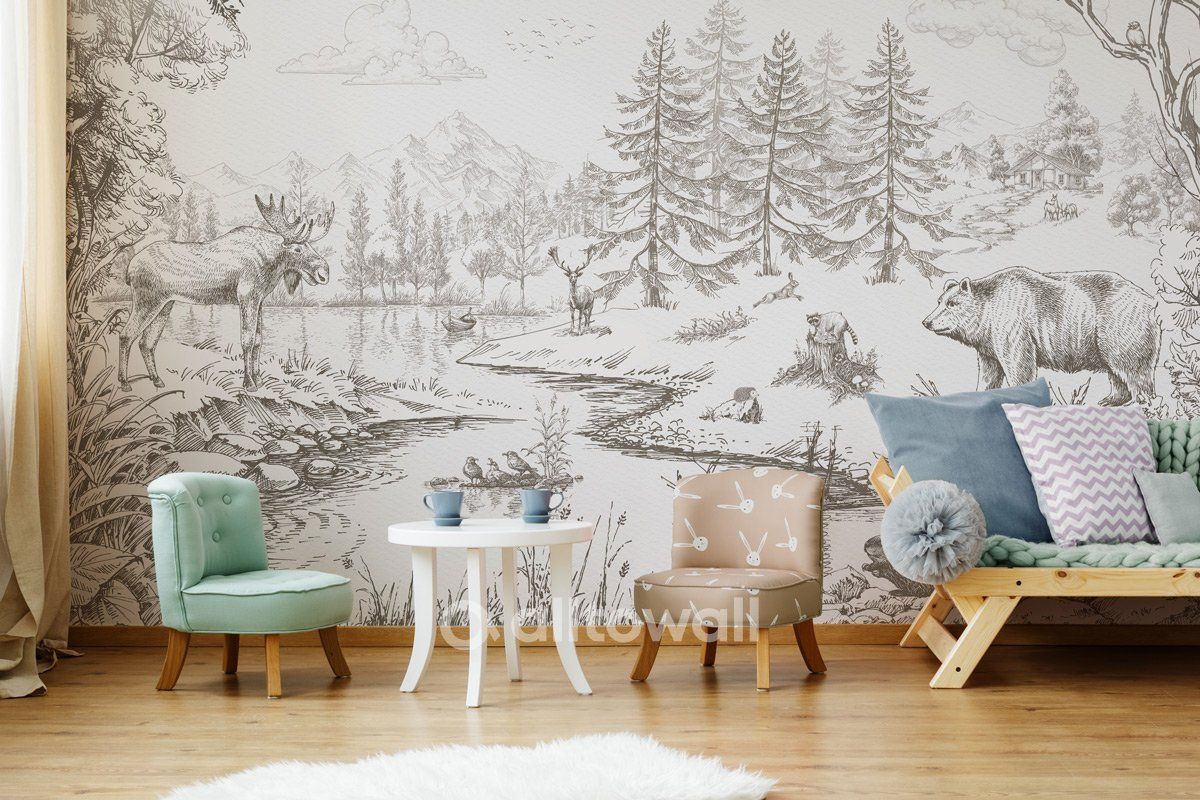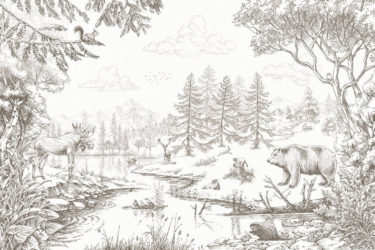 Таёжный лес – модель, выполненная в графическом стиле и отличающаяся двухцветной палитрой. На светлом фоне изображены лесные пейзажи, воды реки, по берегам которой можно увидеть лося, медведя и других животных. Такие покрытия станут отличным решением для комнаты девочки или мальчика, их можно использовать для гостиных, спален или при оформлении гостиничных номеров.