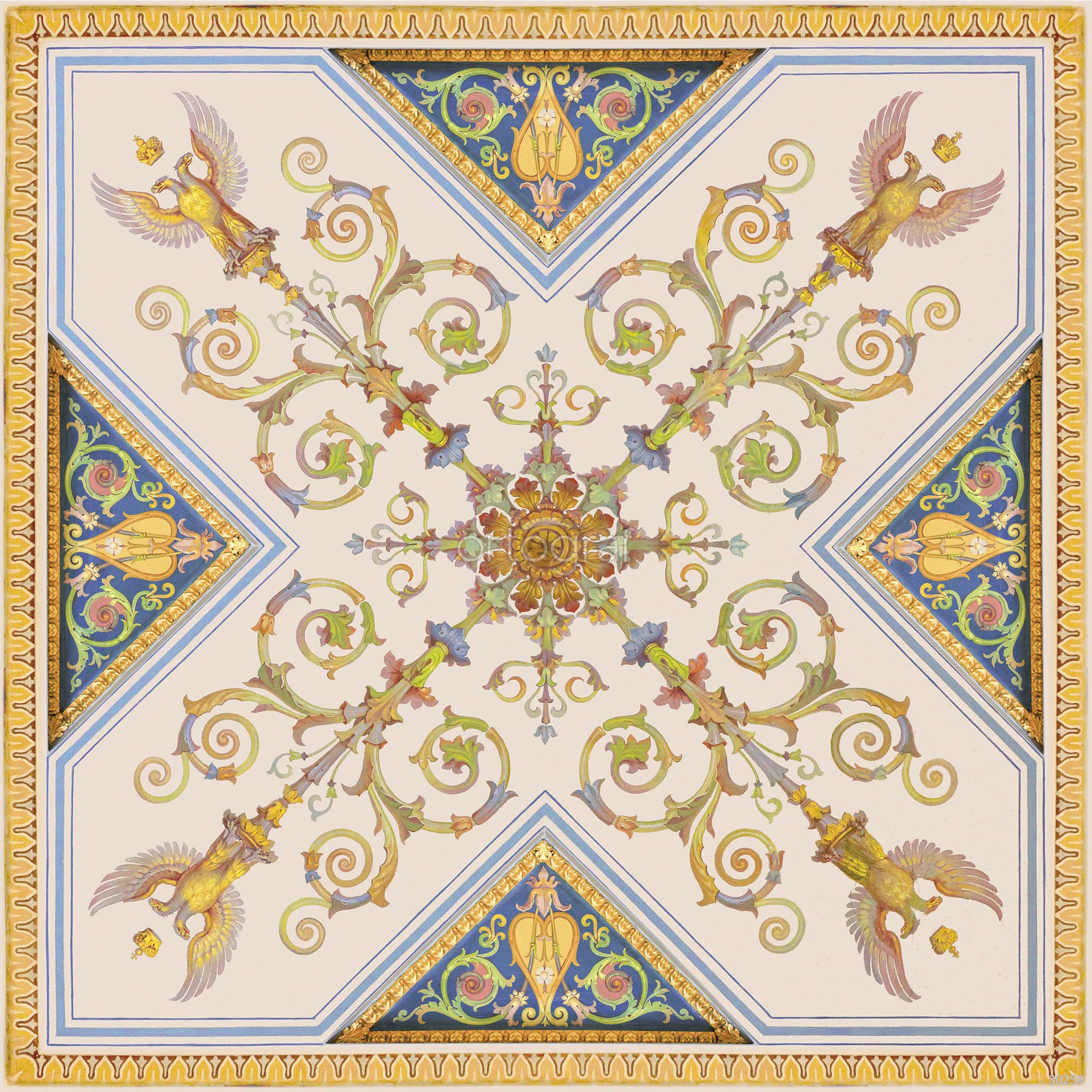 На изображении представлен сложный симметричный орнамент, вдохновлённый мотивами античного или ренессансного декора: центральная розетка обрамлена завитками, цветочными элементами и стилизованными мифологическими птицами с поднятыми крыльями в углах. Композиция напоминает декор потолка или мозаики, где декоративные детали гармонично вписаны в строгую структуру.