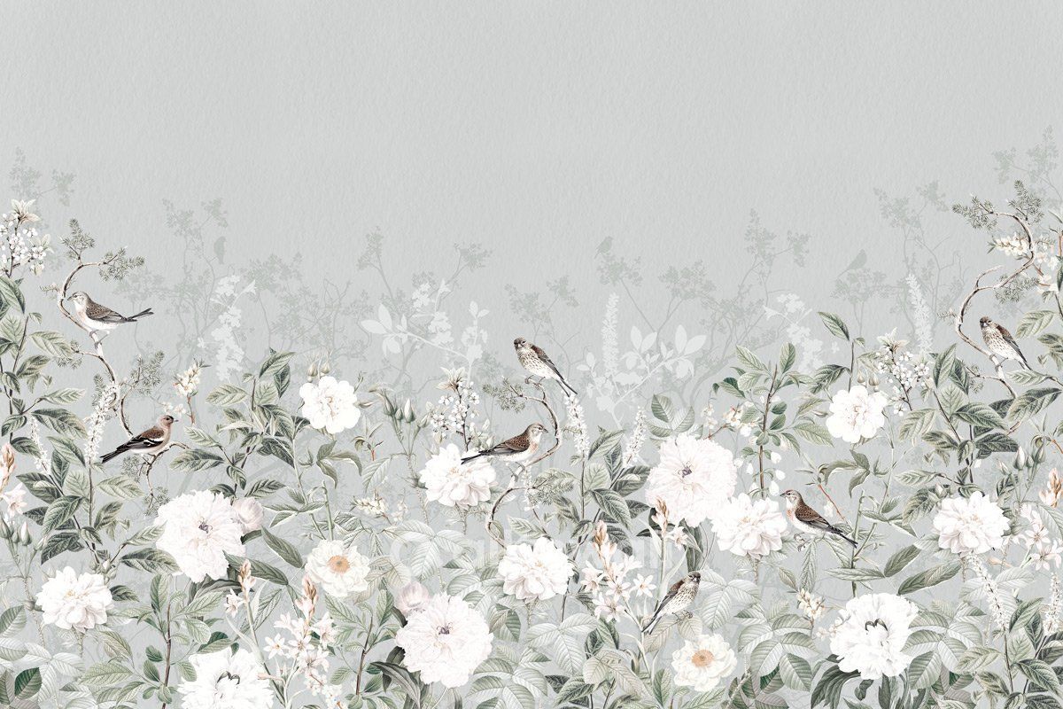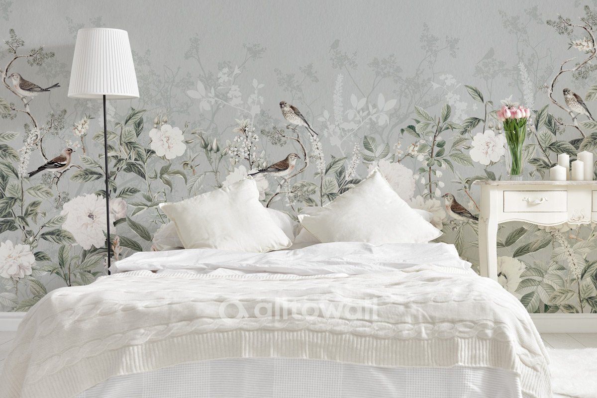 Обои в пастельных серых тонах, которые подчеркнут романтический стиль вашего интерьера. «Цветение» — сюжет с нежными бутонами, растениями и птицами для спальни, гостиной или комнаты подростка.