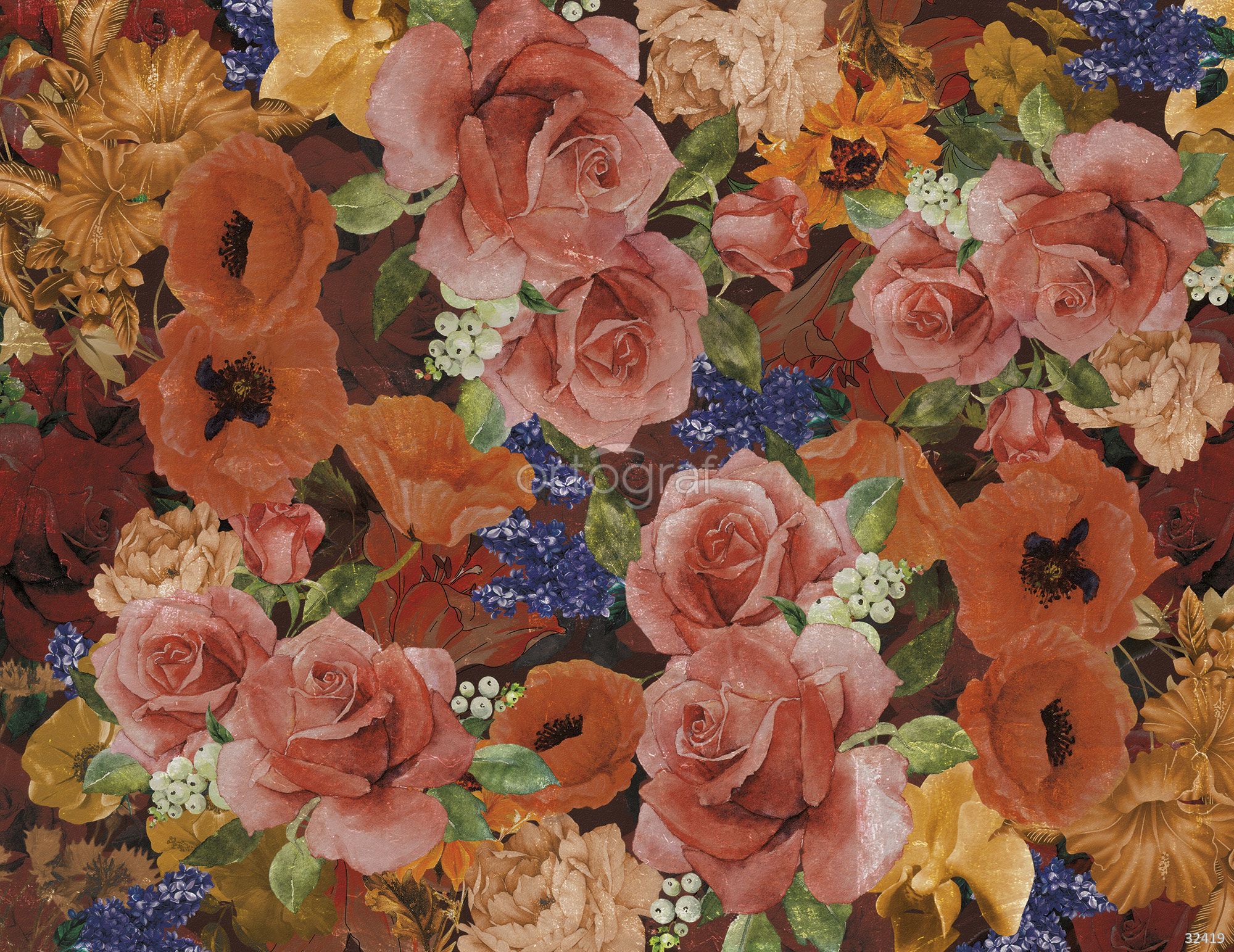 На изображении густая композиция из крупных роз, маков, ирисов и других садовых цветов, переплетённых зелёными листьями. Сюжет наполняет интерьер роскошью, уютом и ощущением изобилия, идеально подходит для акцентных и уютных пространств.