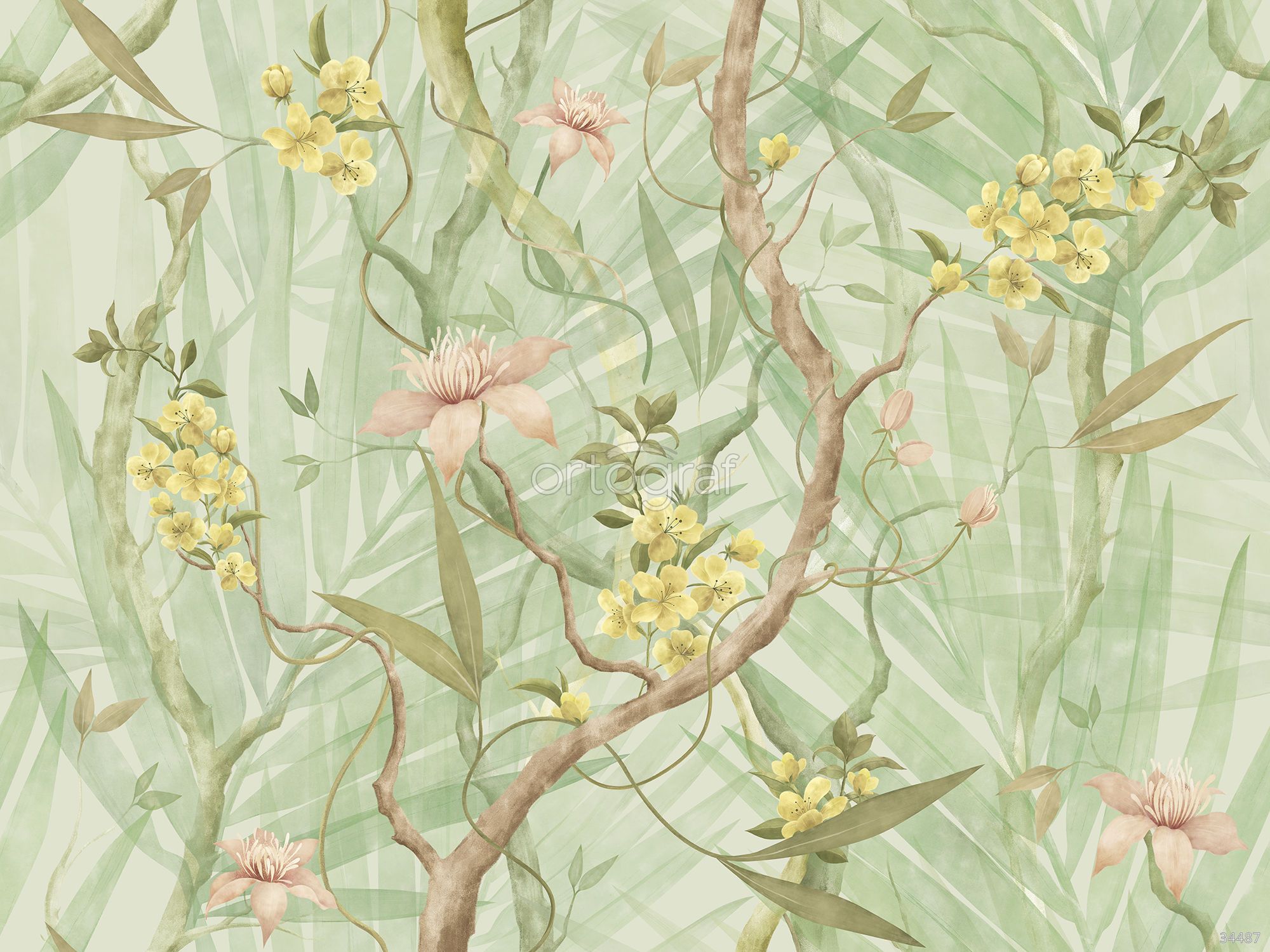 Декоративный рисунок с цветущими ветвями и листвой создаёт ощущение лёгкости и естественной гармонии, наполняя пространство атмосферой сада. Такой сюжет добавляет свежести и уюта, прекрасно подходит для помещений, где хочется подчеркнуть связь с природой и создать условия для отдыха и душевного комфорта. Орнамент универсален и будет уместен как в жилых, так и в общественных интерьерах.