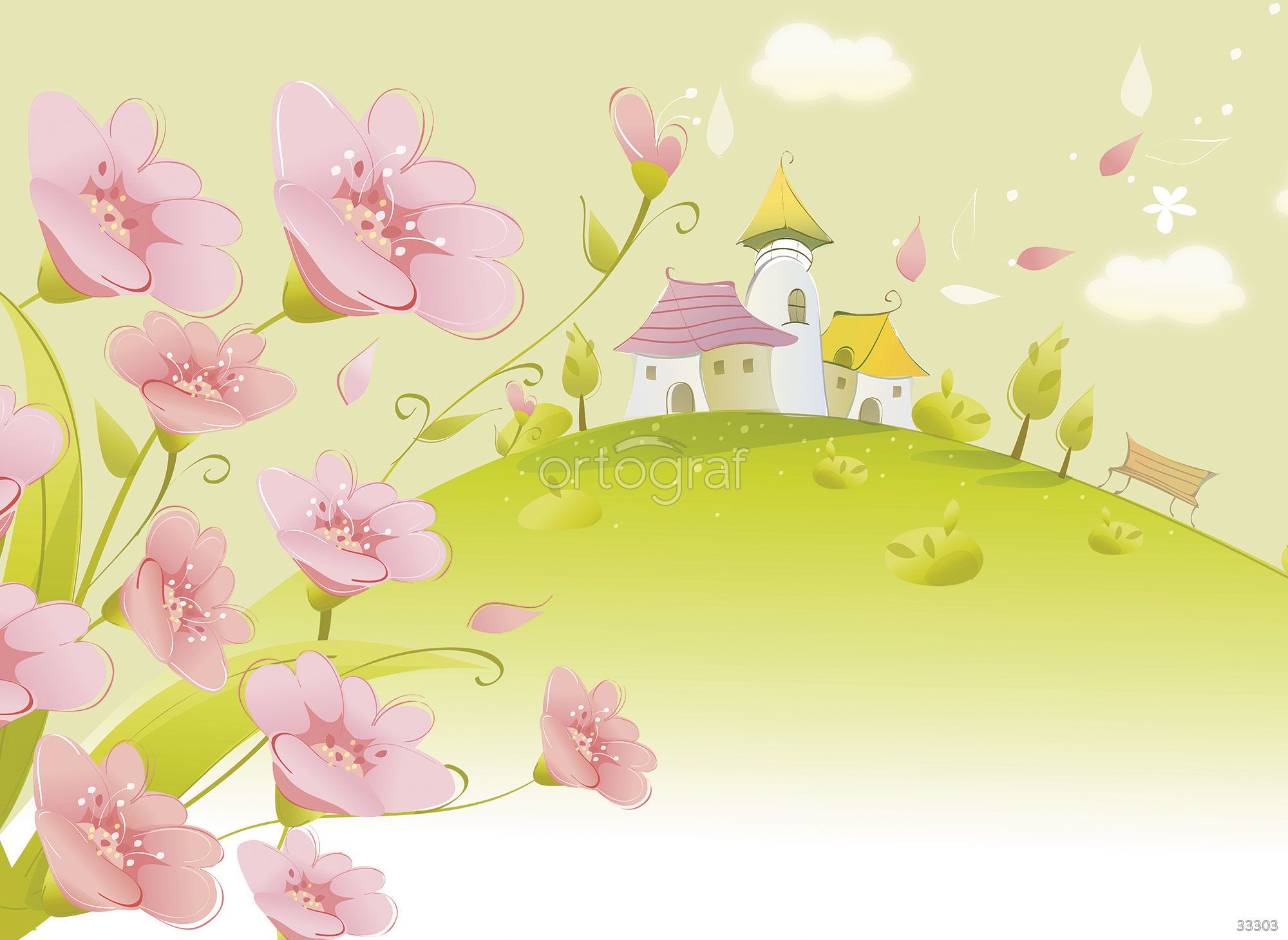 Игривый сюжет с крупными цветами на переднем плане и милыми домиками на холме в окружении деревьев и облаков создает ощущение сказочного мира. Композиция наполнена легкостью и позитивом, что идеально подходит для оформления пространства с атмосферой уюта и весёлого настроения. Такой рисунок особенно гармонично впишется в детский интерьер.