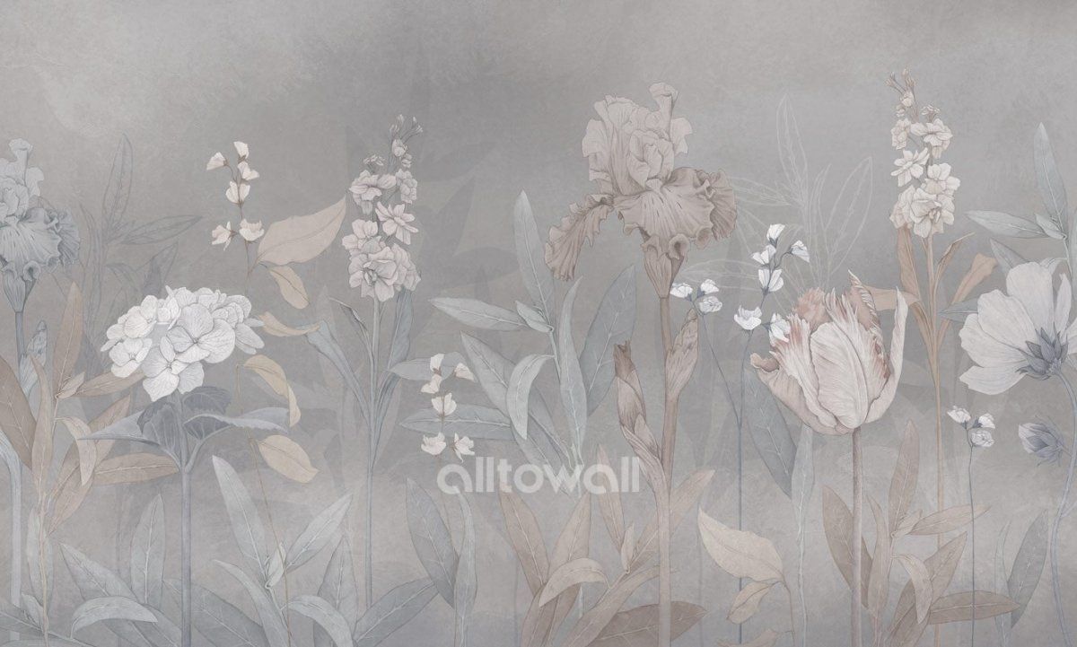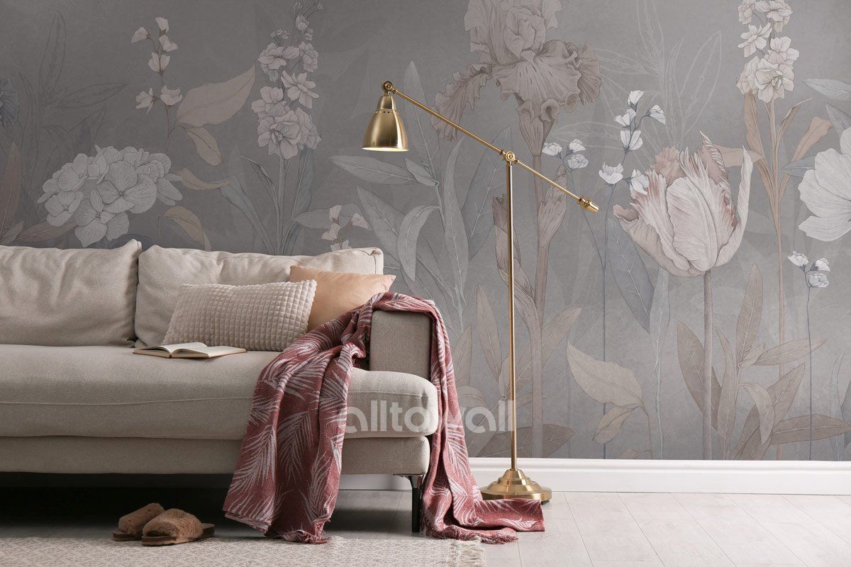 Светло-серые обои с крупными цветами приглушённых оттенков для спальни или гостиной вашей мечты. «Цветочный этюд» — сюжет для тех, кто ценит сдержанные тона и элегантную классику.