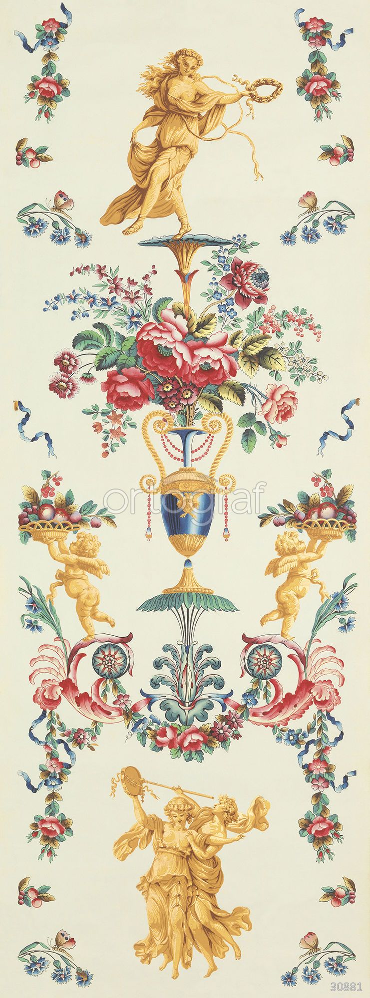 Классический декоративный орнамент с фигурой танцующей девушки, вазой с пышными цветами и парой амуров с корзинами создает атмосферу торжественности и изысканности. Такой сюжет акцентирует внимание на богатых деталях и символах изяществa, отлично подчеркнёт роскошь и гармонию интерьера, особенно в сочетании с классической мебелью.