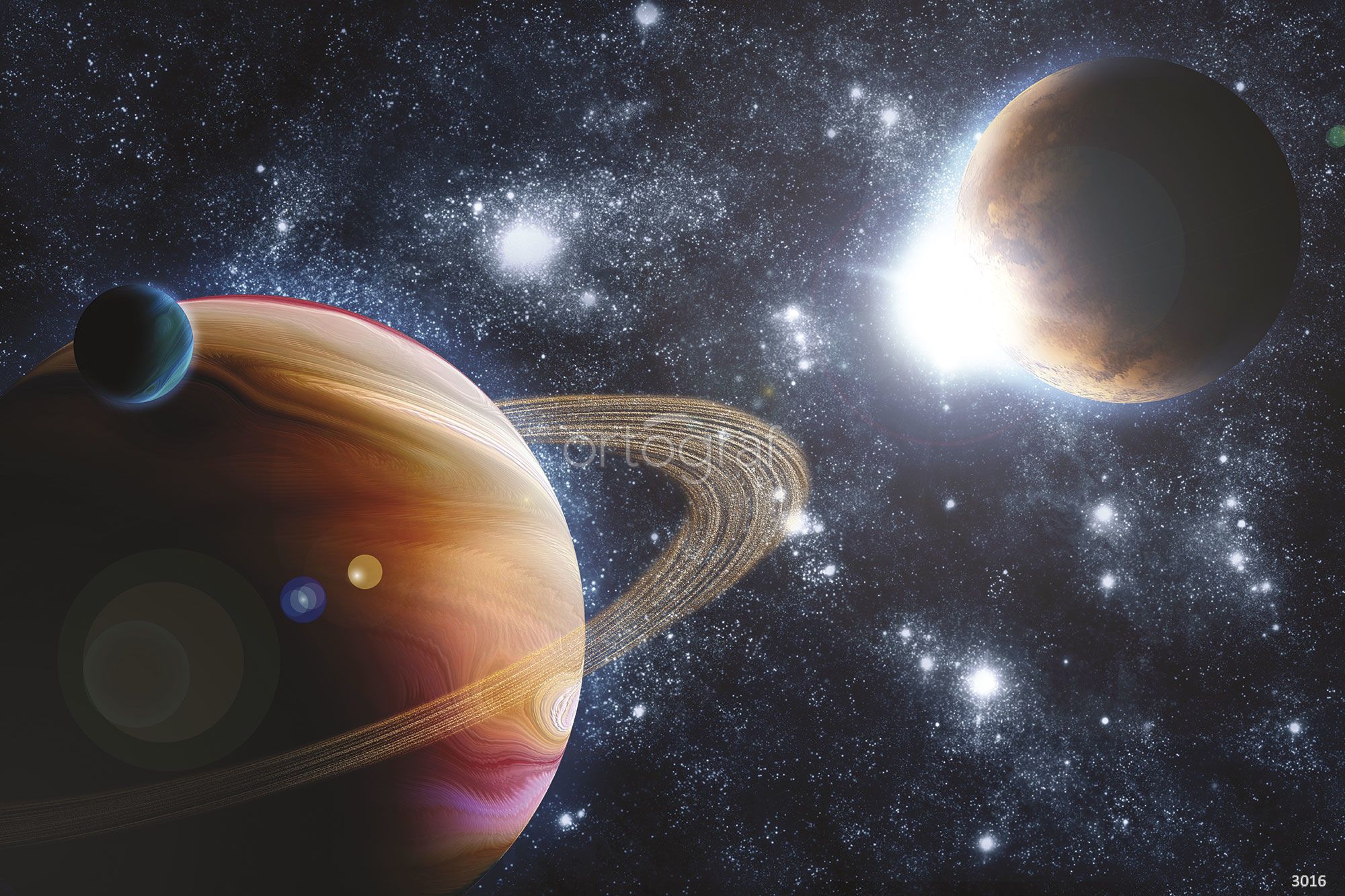 На изображении показана фантастическая космическая сцена: в пространстве парит огромная планета с кольцами, рядом с ней видны крупные и малые спутники, а вдали — ещё одна планета, освещённая ярким звёздным светом. Фон заполняет густое скопление звёзд, создающее ощущение величия и загадочности вселенной, где небесные тела находятся в динамичном соседстве.