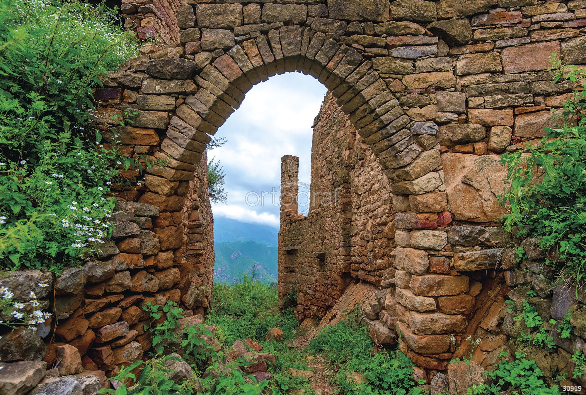 Аутентичные руины старинной каменной постройки с арочным проходом, покрытые зелёной растительностью, создают атмосферу истории и загадочности. Вид на горные дали через арку подчеркивает глубину пространства и визуально расширяет интерьер. Такой сюжет отлично впишется в современные или классические интерьеры, придавая им особый шарм.