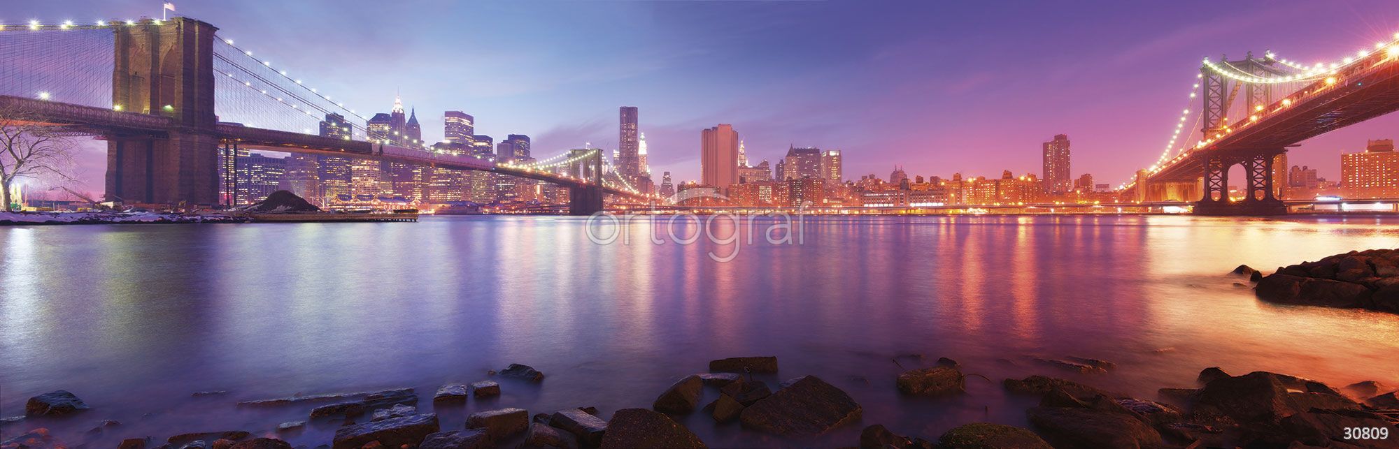 Панорамный ночной вид на два городских моста, сияющий огнями мегаполис и отражения на реке создают атмосферу динамики, романтики и современного урбанистического пейзажа. Такой сюжет отлично подходит для просторных современных помещений, добавляя ощущение света, ритма и пространства города.